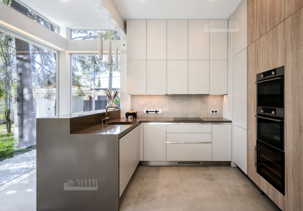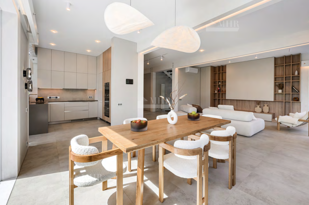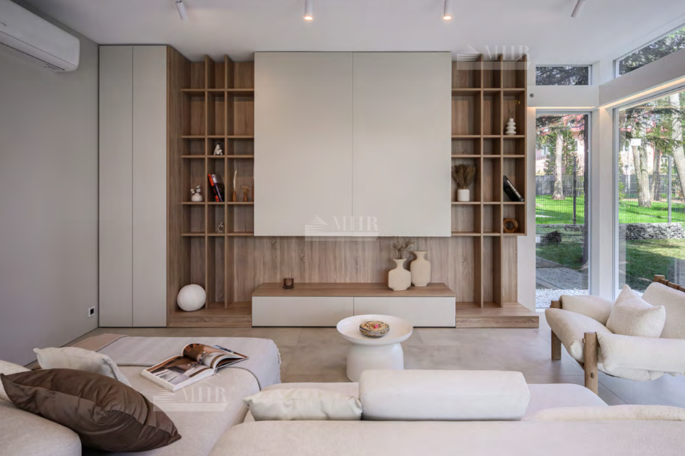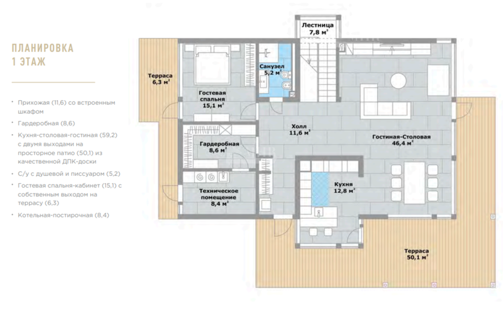 1й этаж: прихожая со встроенным шкафом, просторная гардеробная, кухня-столовая-гостиная с двумя выходами на просторное патио из качественной ДПК-доски, санузел с душевой и писсуаром, гостевая спальня-кабинет с собственным выходом на террасу, котельная-постирочная;