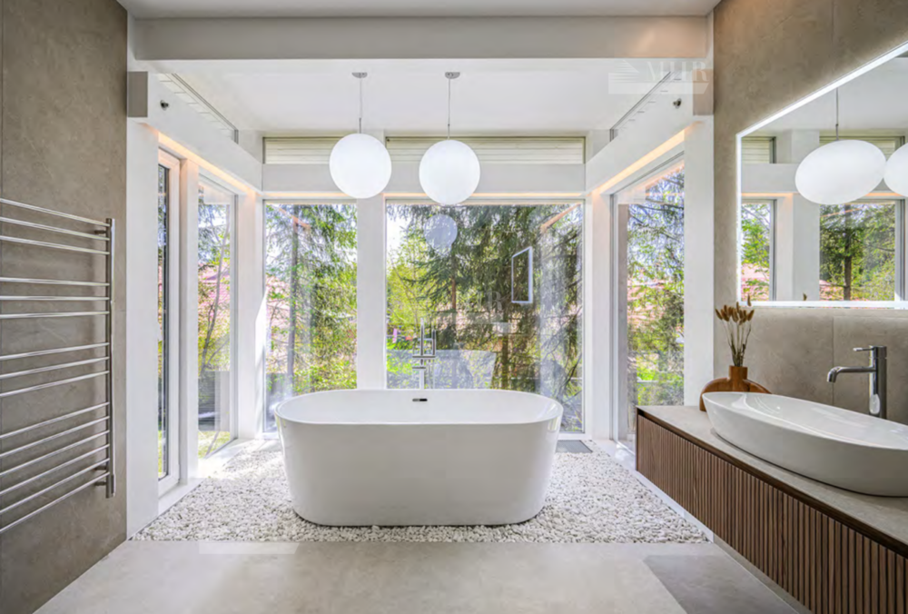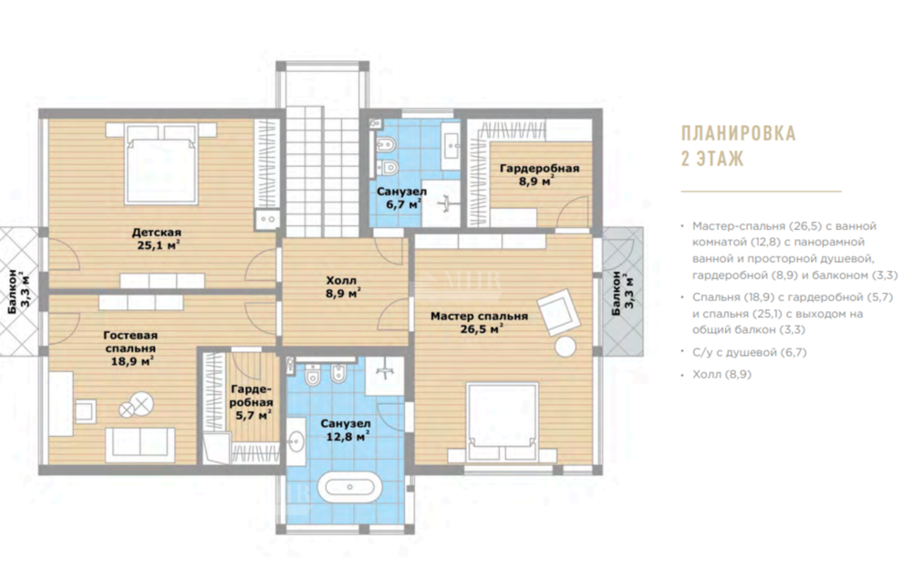 2й этаж: мастер-спальня с ванной комнатой, с панорамной ванной и просторной душевой, гардеробной и балконом, спальня с гардеробной и спальня с выходом на общий балкон, санузел с душевой, холл.