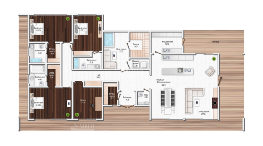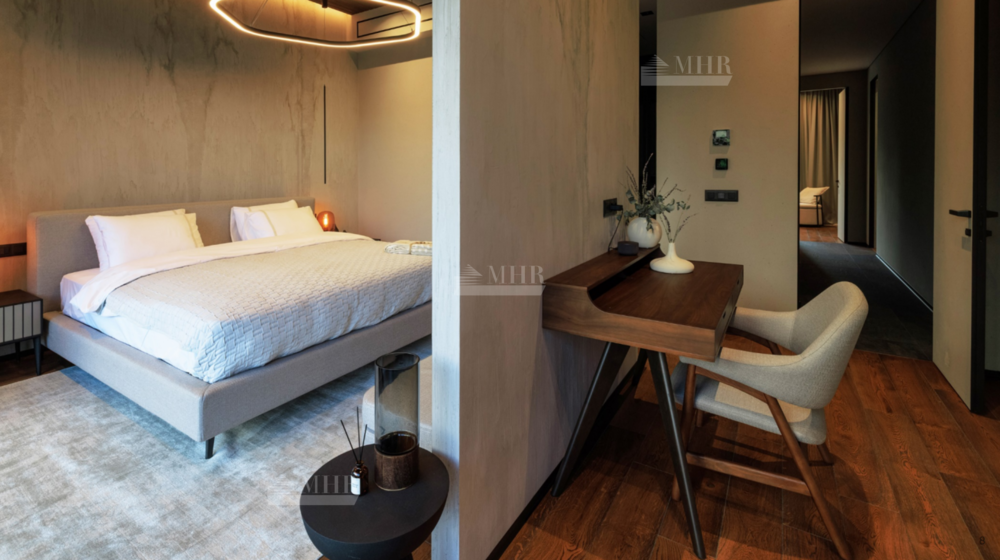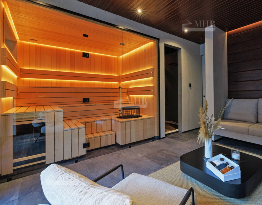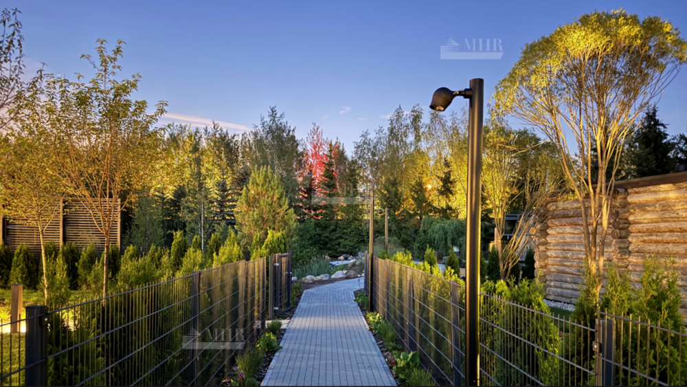 В доме 4 спальни, 4 с/у, финская сауна, гараж на 2 м/м, квартира для персонала. На территории участка установлен автополив.
