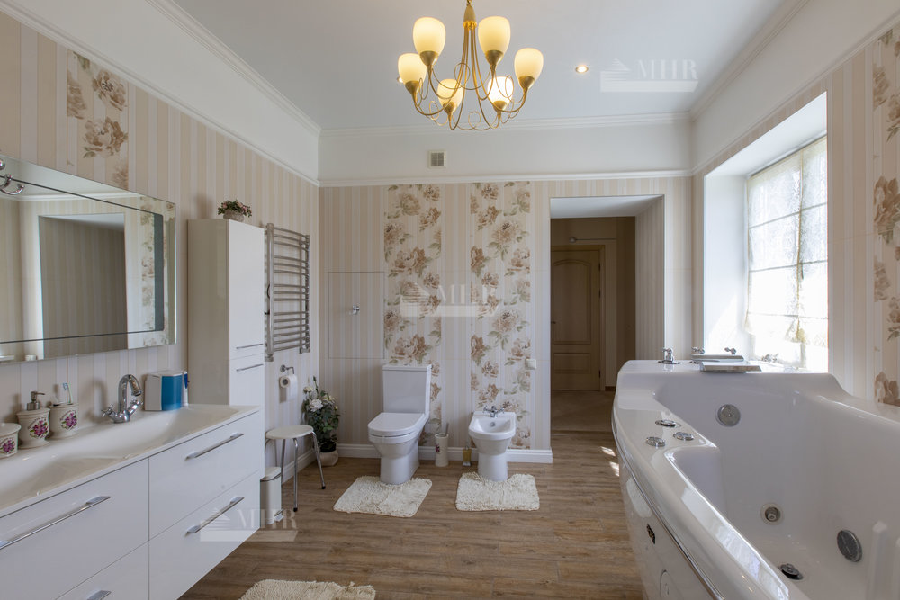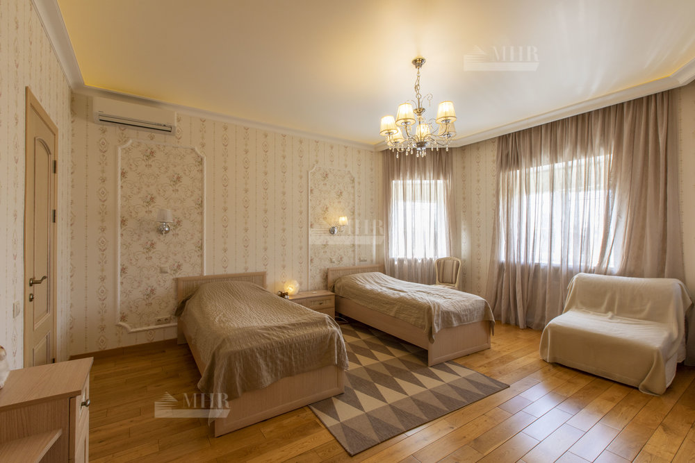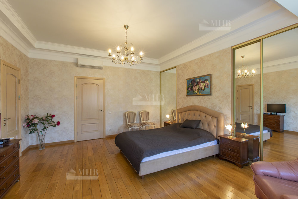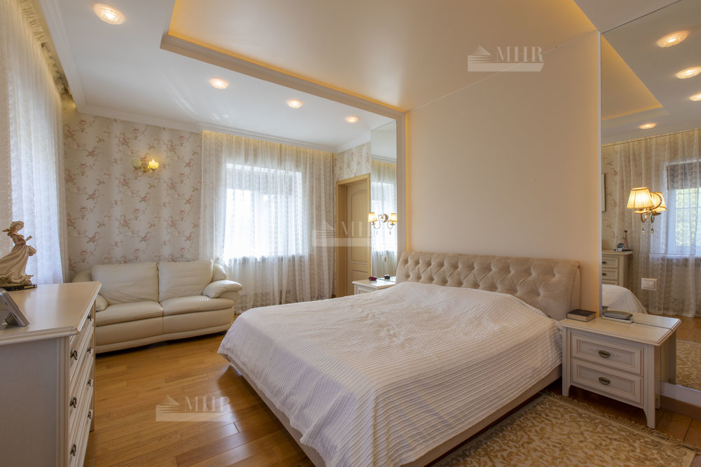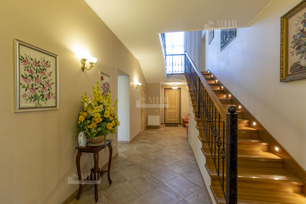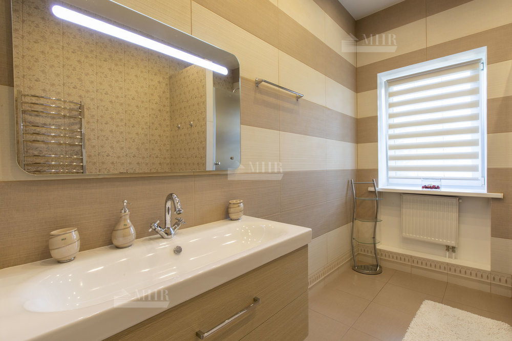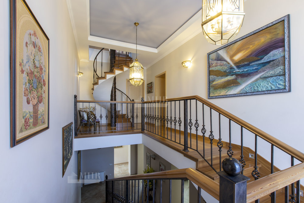 В интерьере использованы натуральные материалы. Двери изготовлены из массива дерева, полы сочетание инженерной доски и плитки, массивная доска. Кондиционирование в каждой комнате. Дом разбит на жилые, досуговые и общие зоны.