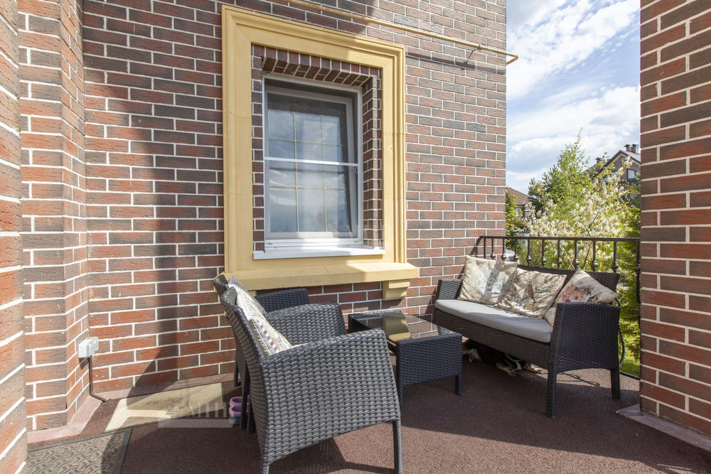 Дом построен из кирпича. Перекрытия монолитный железобетон. Покрытие кровли металлочерепица. Отделка фасадов облицовка клинкерной плиткой. Окна двойные деревянные стеклопакеты, отделка фасада керамическими элементами. Декорирование фасада архитектурными элементами выполнено из архибетона.