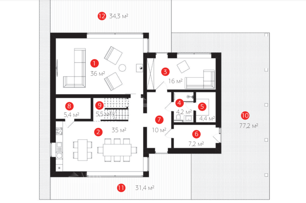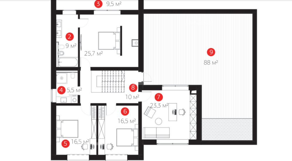 Просторный дом, где есть все необходимое для жизни, отдыха и даже работы. 4 спальни, включая гостевую на первом этаже и просторный мастер-блок с гардеробом и ванной, большой кабинет с собственным выходом на террасу второго этажа, функциональная кладовая комната при кухне, хаммам и детские с панорамными окнами.