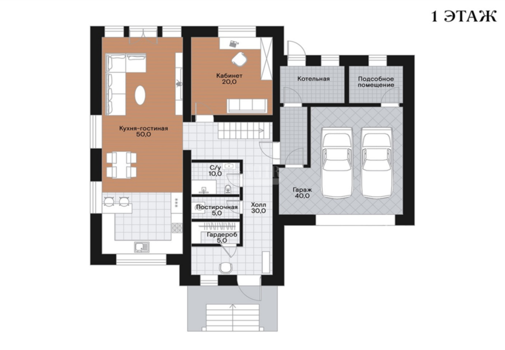 1й этаж: холл, гардеробная, постирочная, санузел, кухня-столовая, гостиная с камином и выходом на террасу, кабинет, котельная, гараж на 2 машиноместа, кладовая;