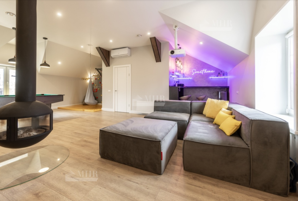 2й этаж: игровая зона с камином, бильярдной и барной стойкой, проектор, мастер-блок: гардеробная, ванная, спальня, спальня с гардеробной и санузлом, детская спальня.