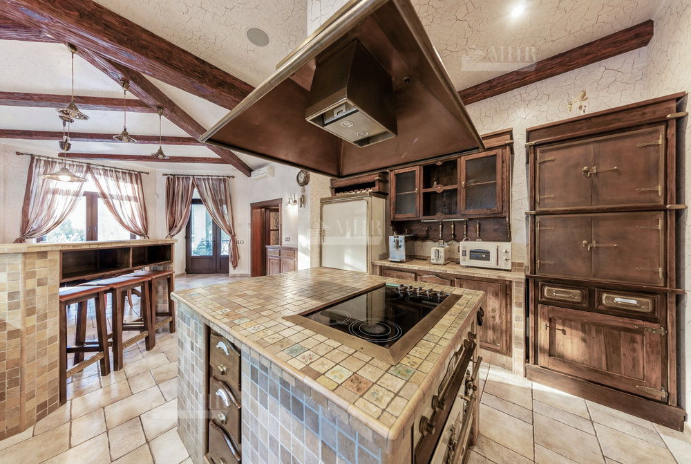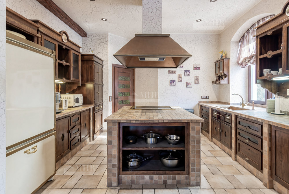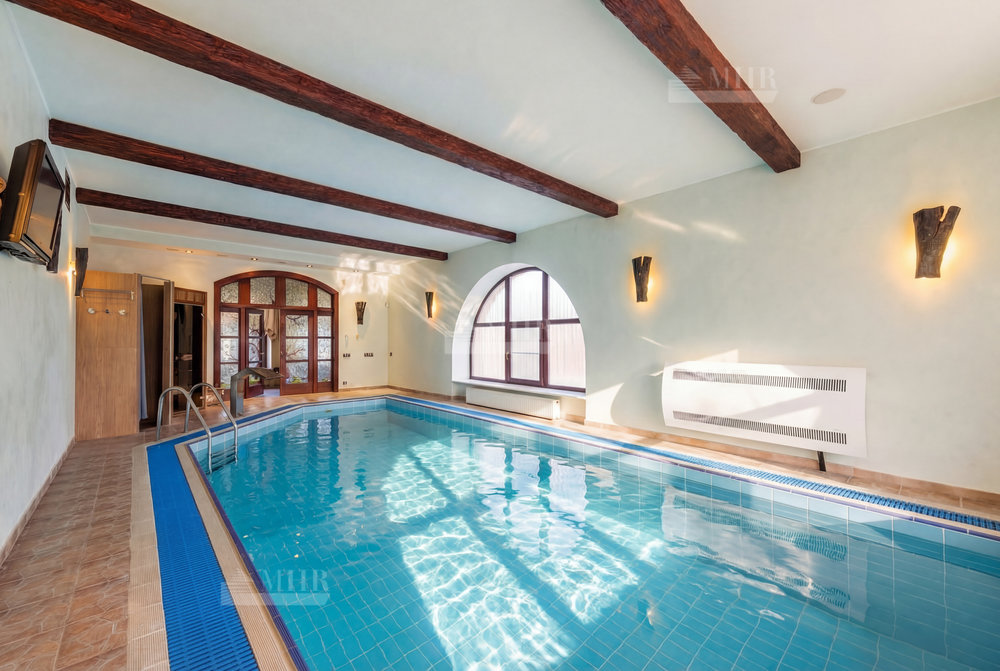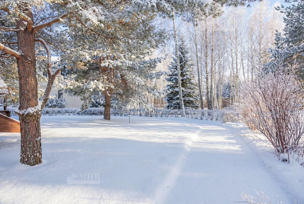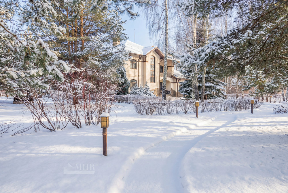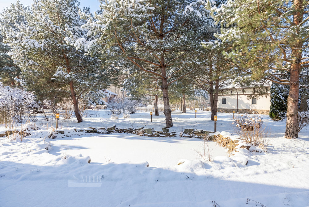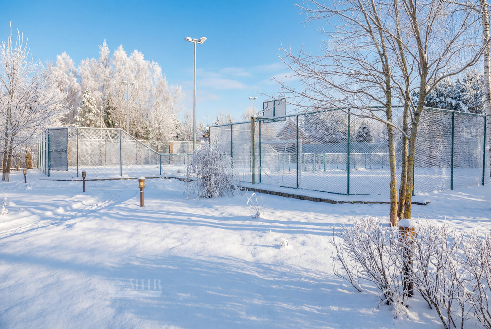 На участке разместились: теннисный корт с мачтами освещения и дренажной системой, футбольное поле и баскетбольная площадка, беседка для барбекю, декоративный пруд.