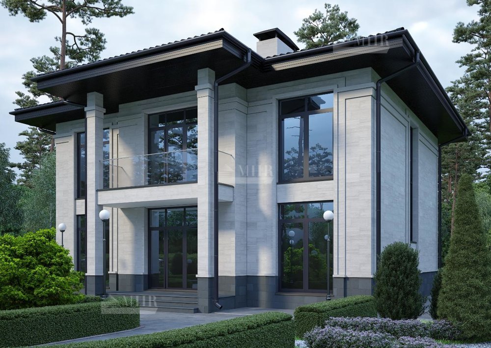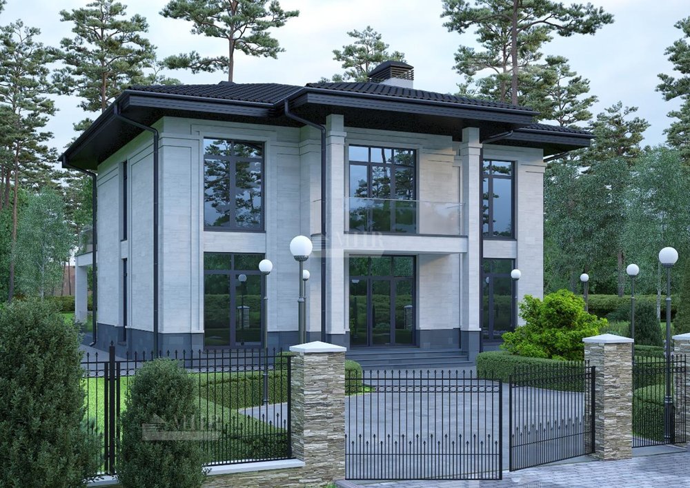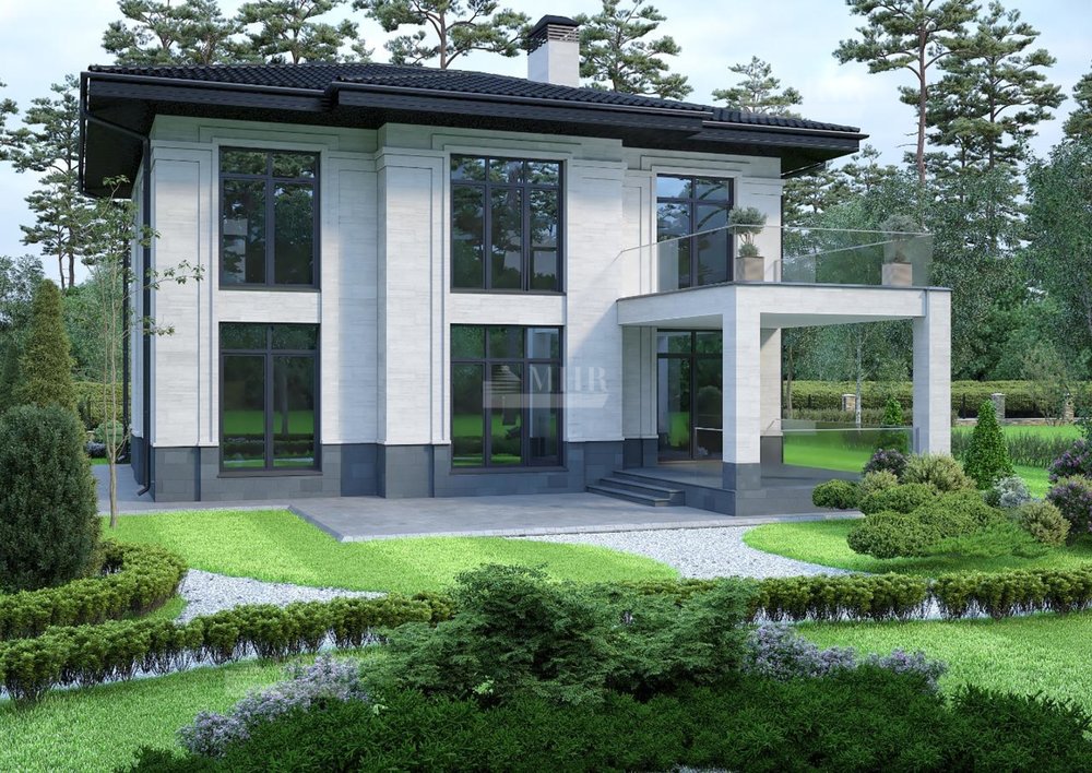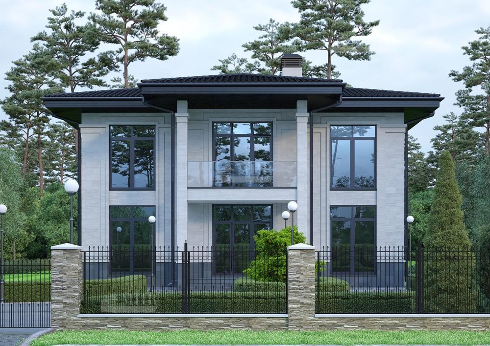Дом строится на участке правильной прямоугольной формы. По периметру будут высажены кустарники и деревья, а основная часть территории уложена газоном и готова к идеям по благоустройству. Внешняя отделка дома будет выполнена премиальными материалами в серо-молочной гамме: натуральный песчаник, цементно-песчаная черепица, планкен.