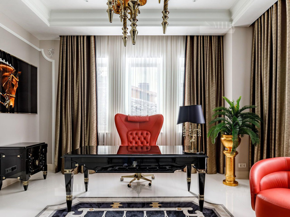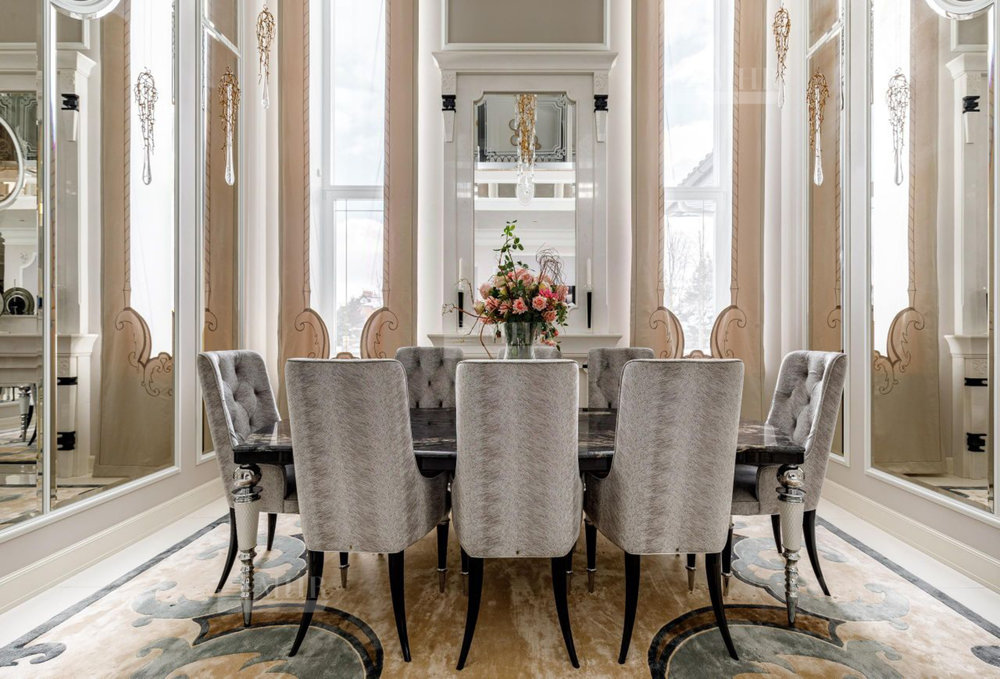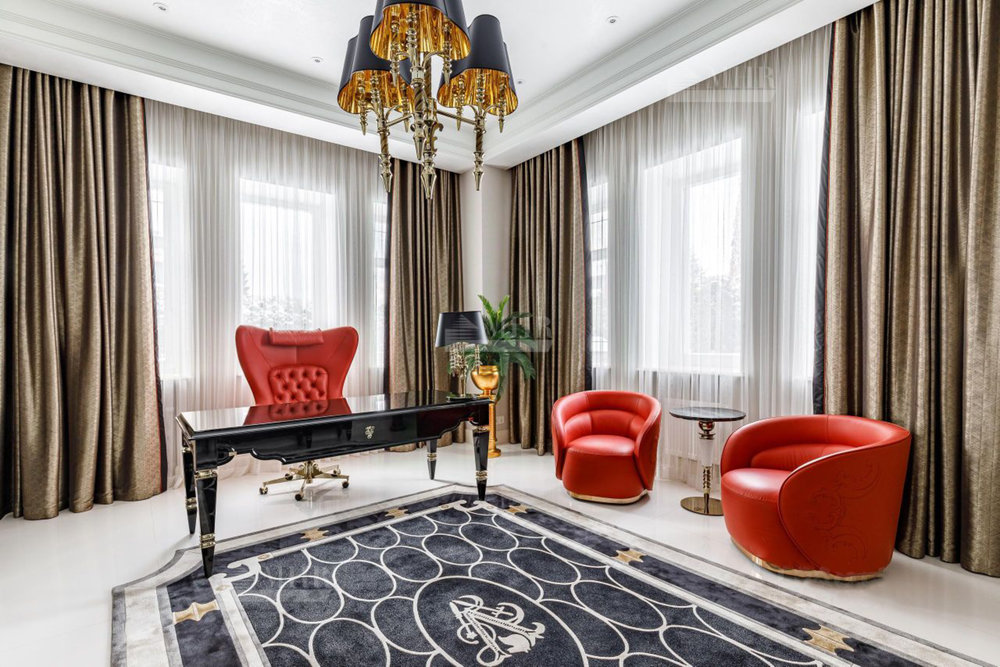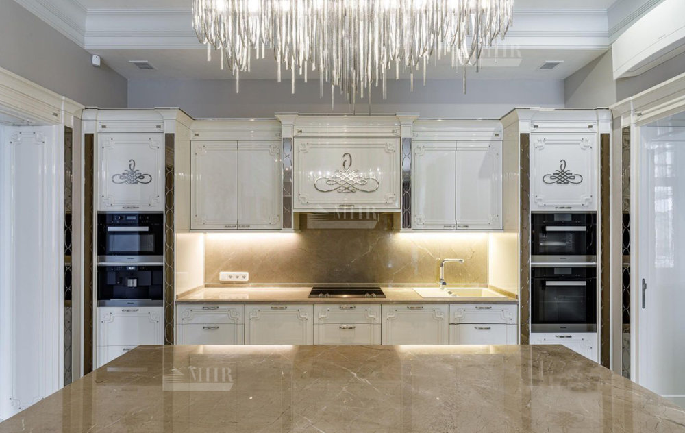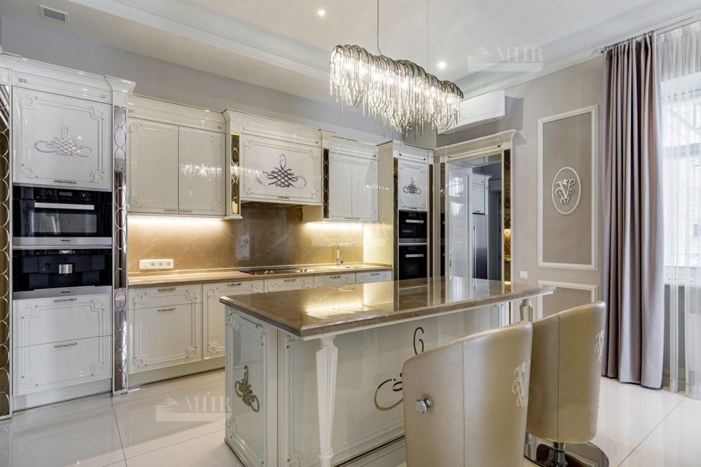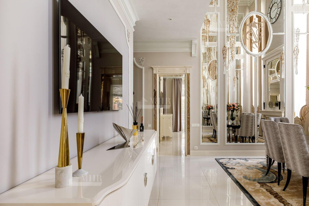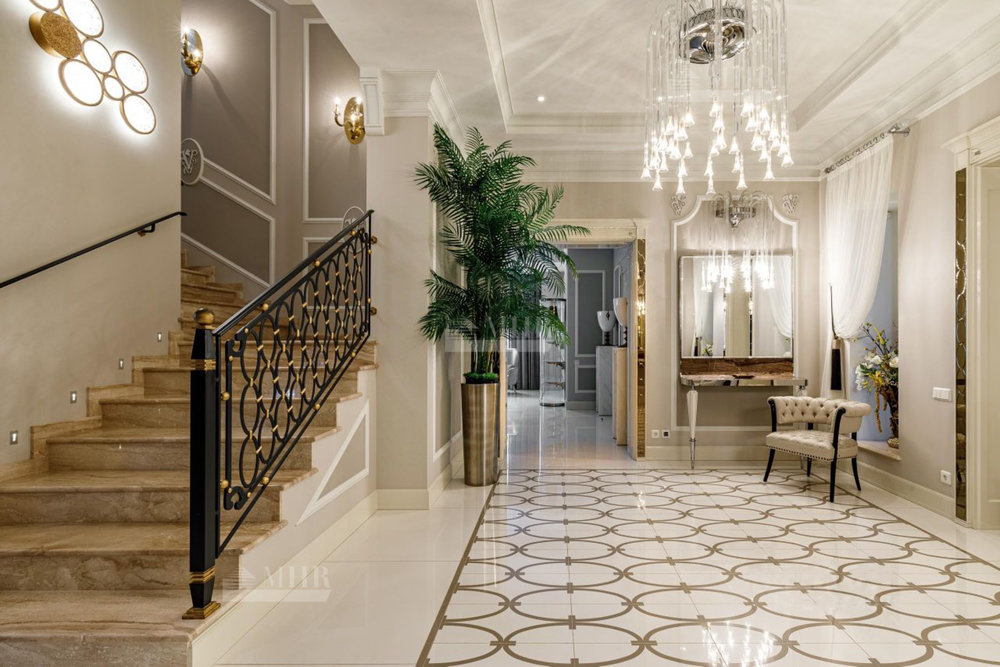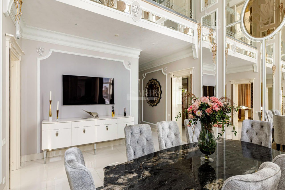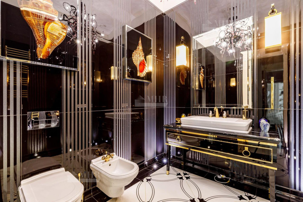 Стены украшает изящная лепнина и фрески, а полы покрывает итальянский мрамор, в отделке дома использован оникс. Дом полностью мебелирован и наполнен изысканными предметами интерьера от Visionnaire (Италия), Swarovski и др. В доме высокие потолки, есть лифт.