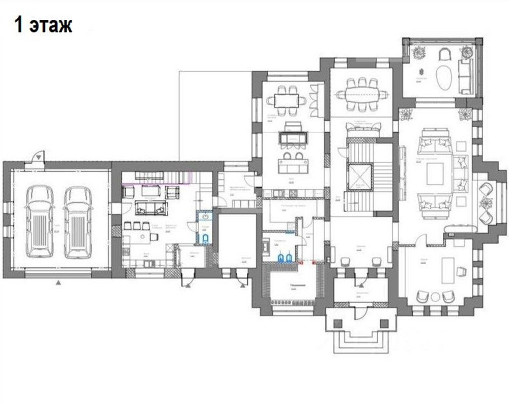 1 этаж: холл со вторым светом, с/у, кухня со столовой зоной, столовая для приема гостей, гостиная, кабинет, патио, тех. помещения, гараж с переходом в блок для персонала с 2 спальнями, 2 с/у и технической кухней.