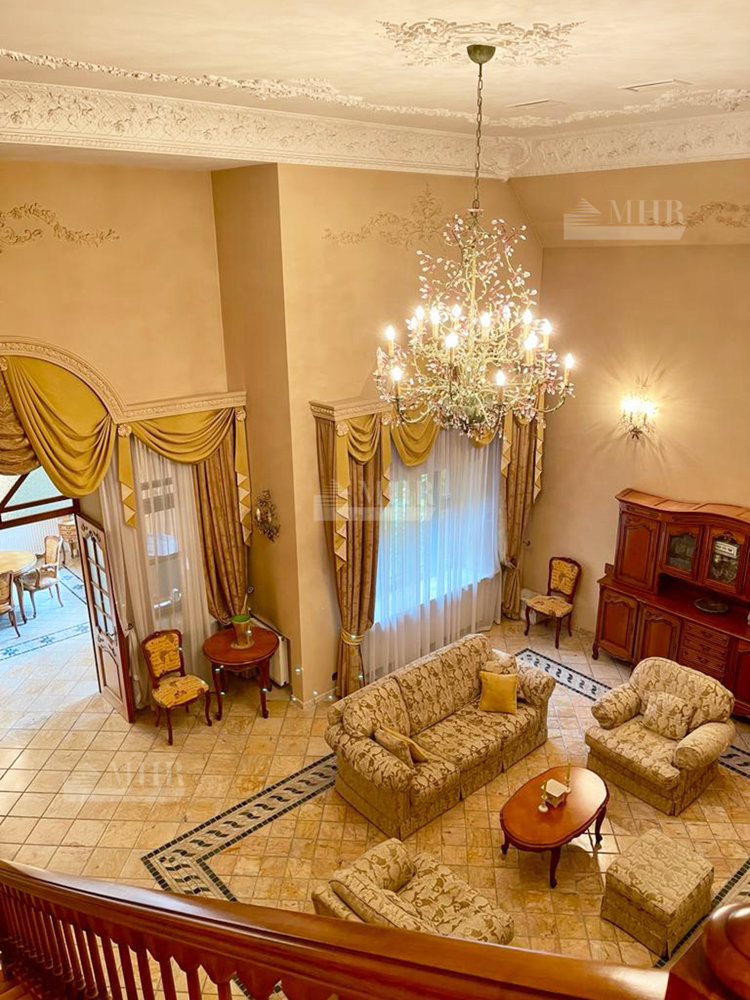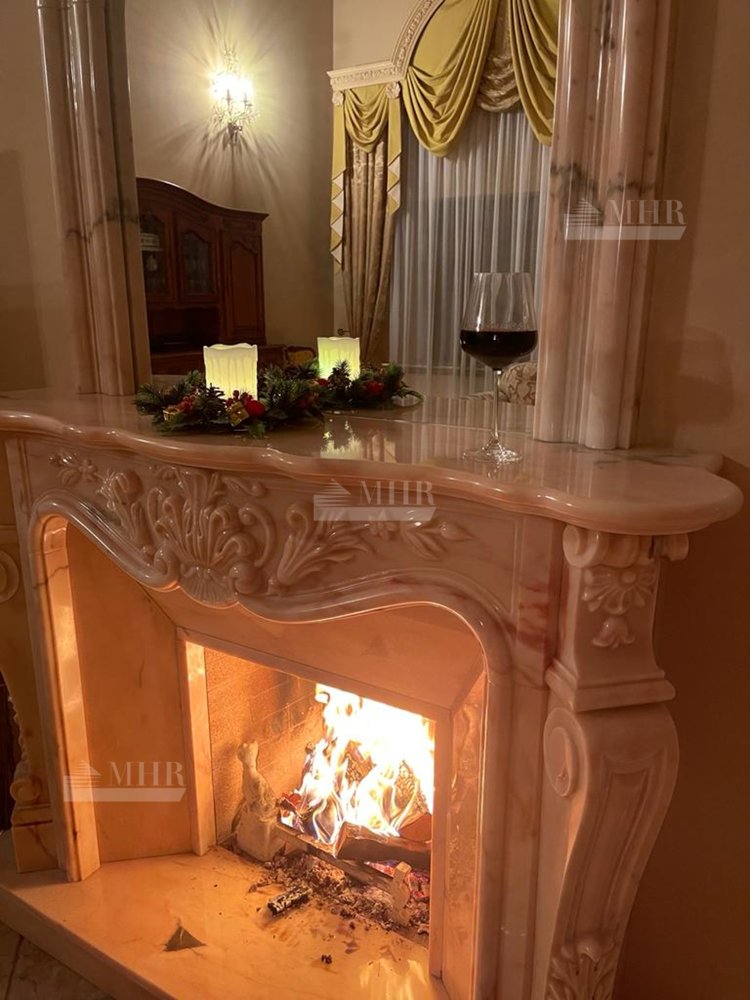 Из уютной гостиной (высота потолков более 6 м), выдержанной в светлых теплых тонах, можно попасть в столовую с панорамными окнами. В столовой имеется подогрев полов. В гостиной имеется действующий камин (топится дровами) из розового мрамора. Полы в гостиной, столовой, холлах 1 и 2 этажей из итальянского мрамора теплого песочного цвета с инкрустацией мрамором зеленого цвета.