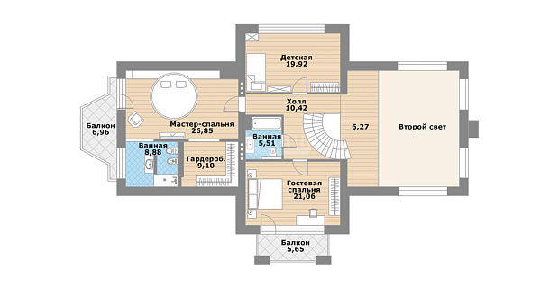 2-й этаж: мастер спальня с двумя с/у и двумя гардеробными комнатами, три спальни  с комнатой для няни, три с/у, семейная гостиная.