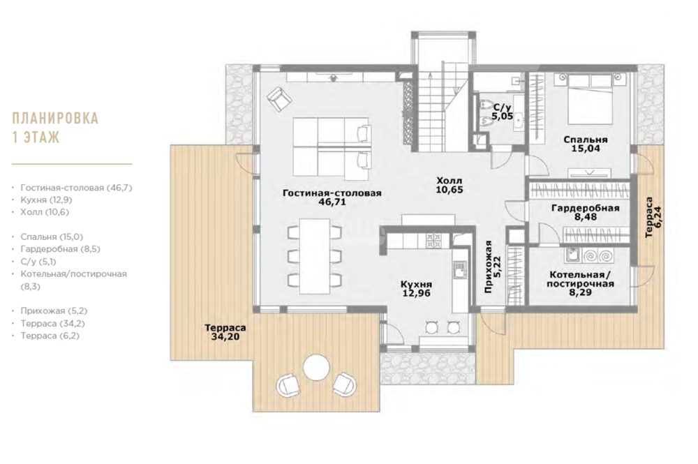 1-й этаж: прихожая, 2 террасы, гостиная-столовая, кухня, холл, спальня, гардеробная, с/у, котельная/постирочная;