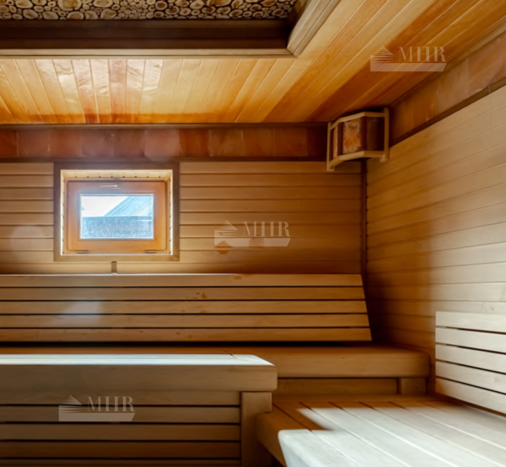 В СПА зоне русская баня на дровах, кухня, спальня, душ, с/у и выход на веранду.