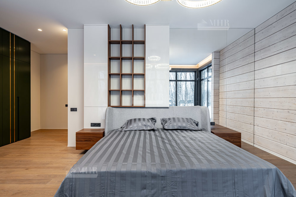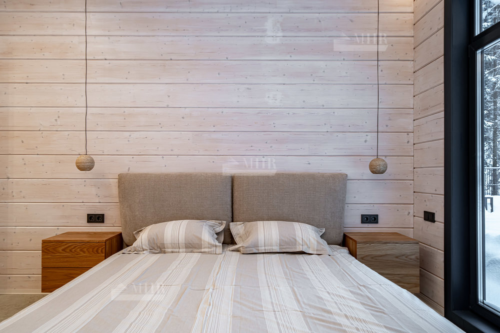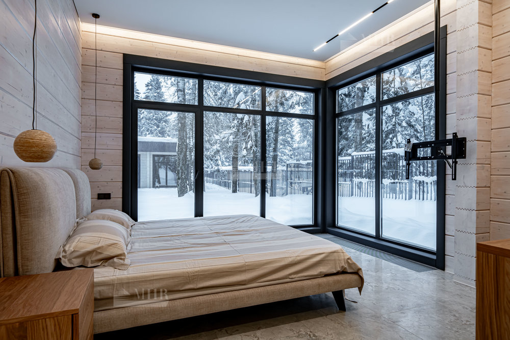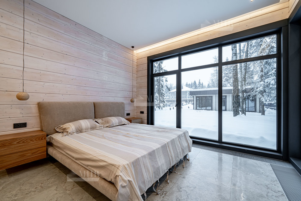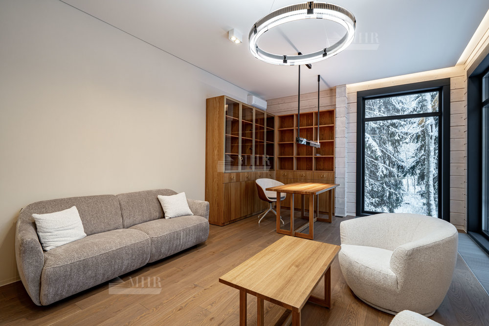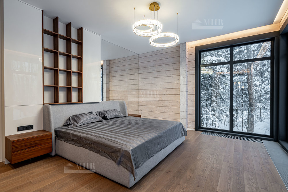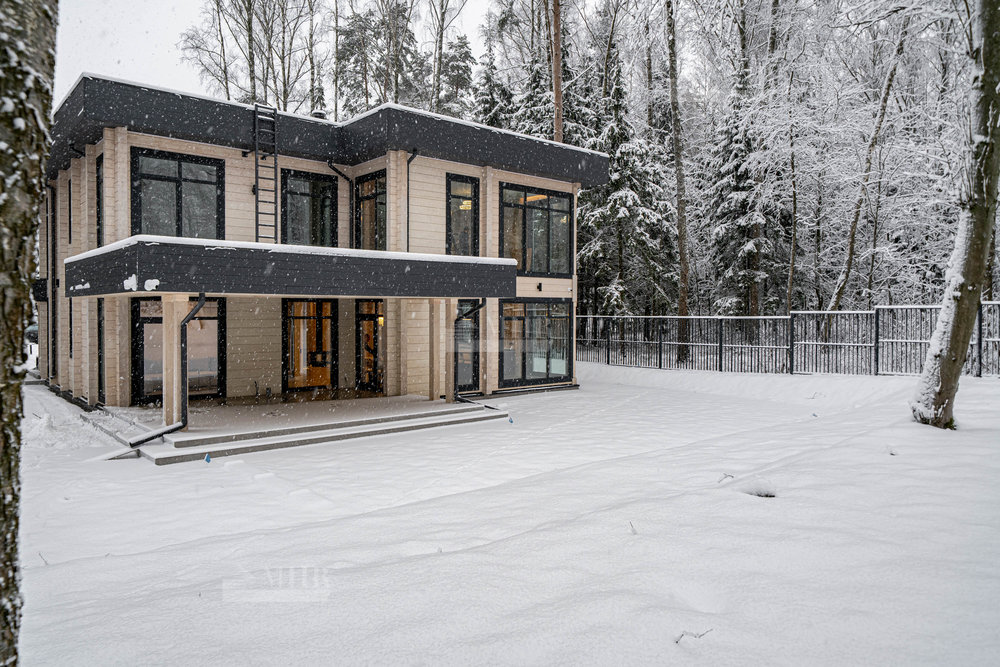Участок площадью 27 соток граничит с лесом и сохраняет естественный природный рельеф. На территории оставлена березовая роща, выполнена подсветка по периметру и вдоль дорожек.