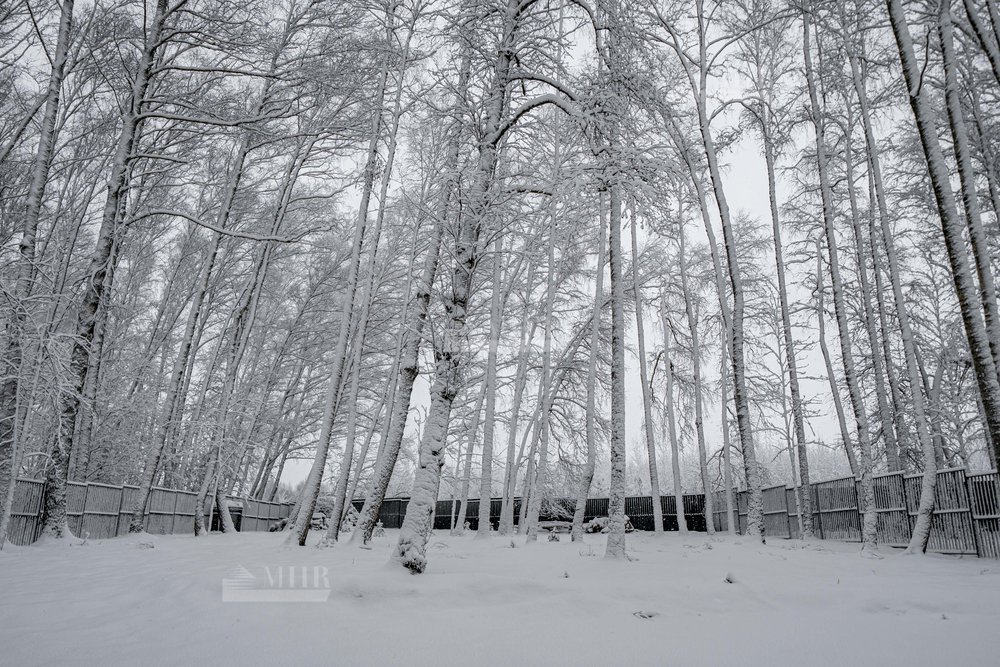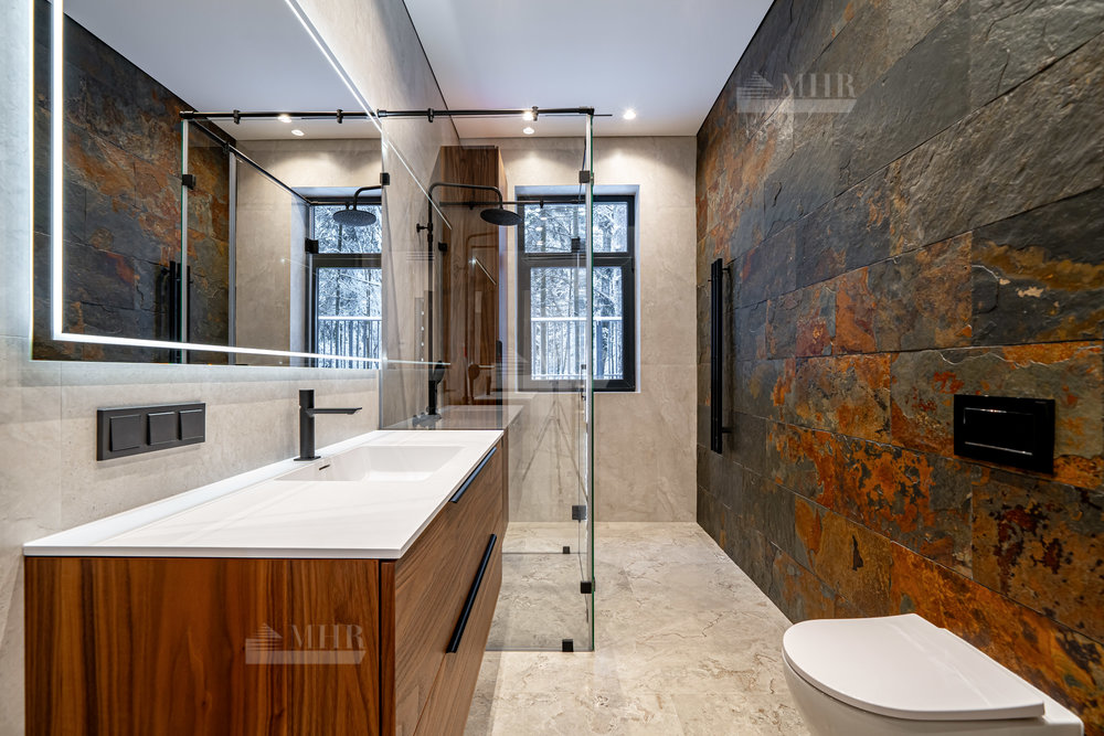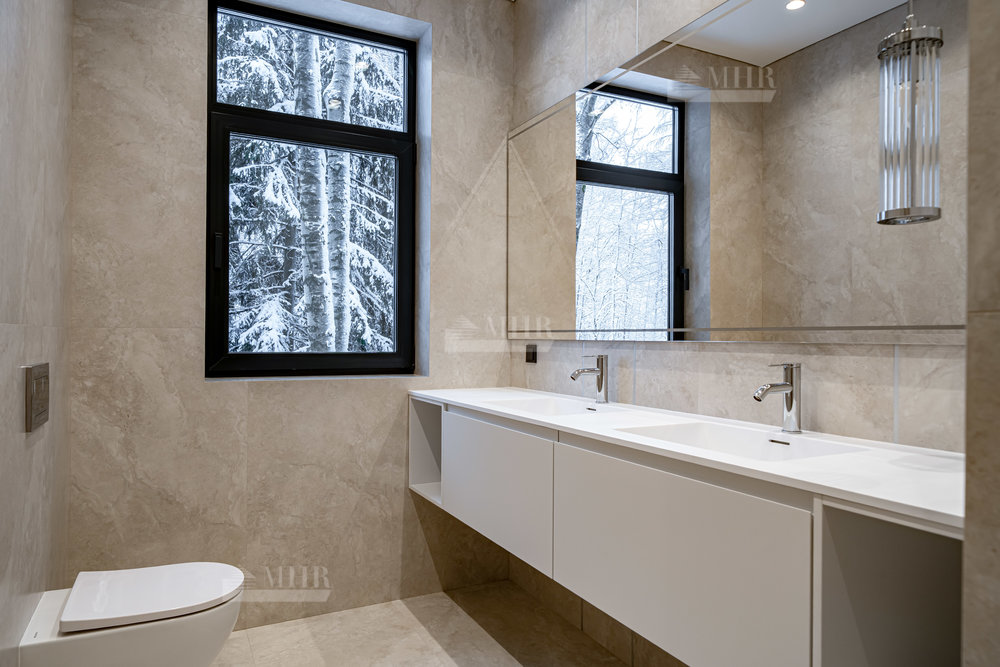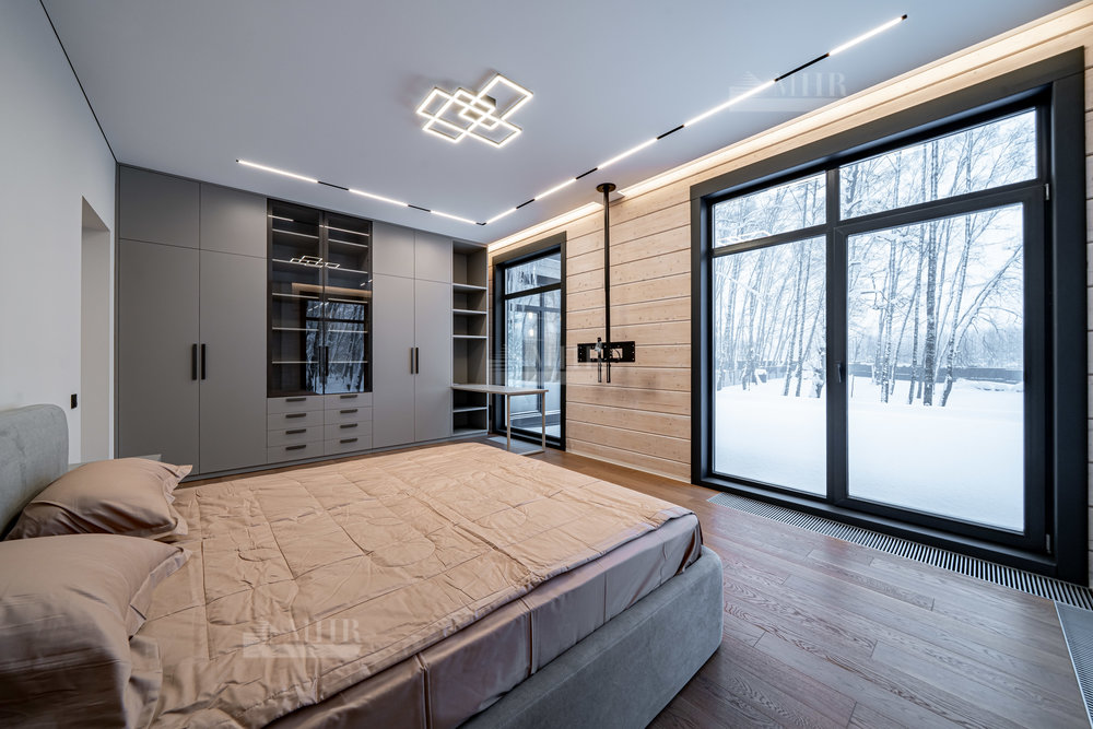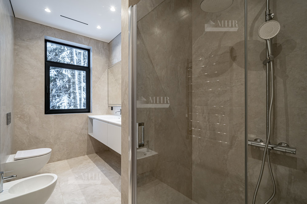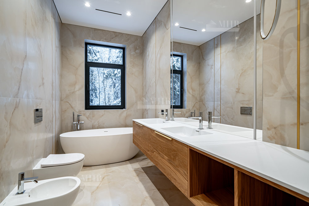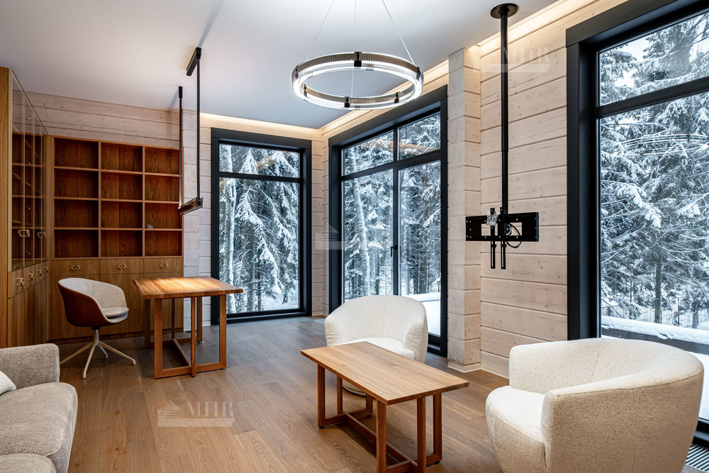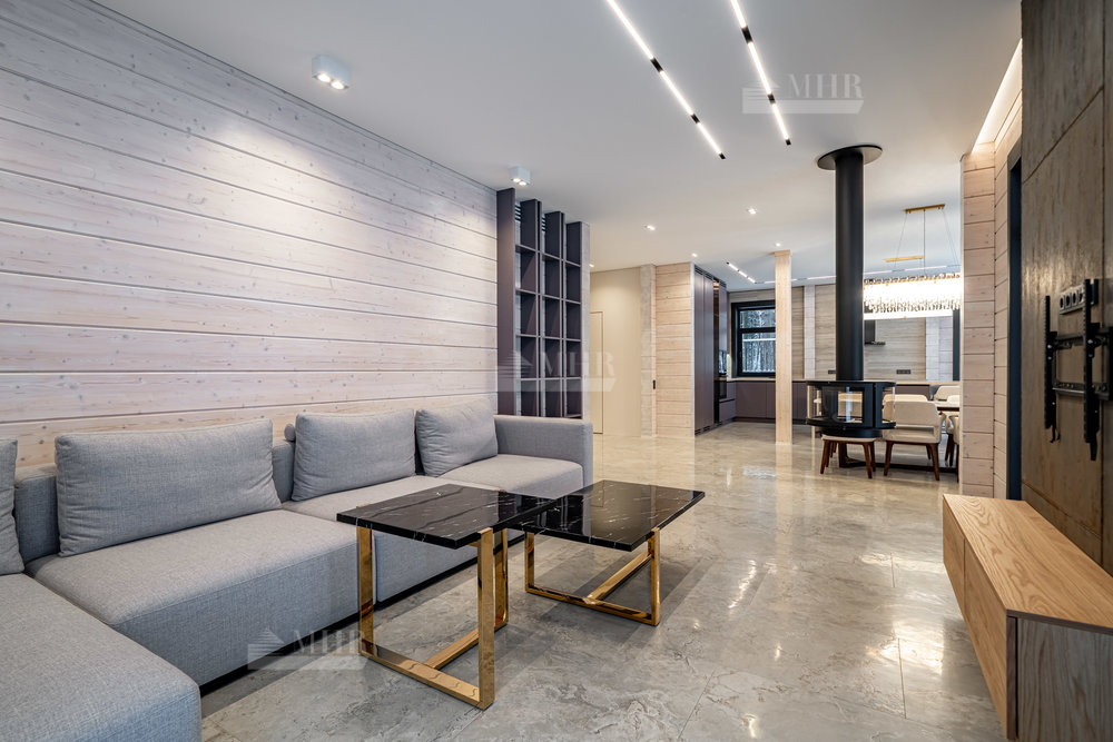 Участок площадью 27 соток граничит с лесом и сохраняет естественный природный рельеф. На территории оставлена березовая роща, выполнена подсветка по периметру и вдоль дорожек.