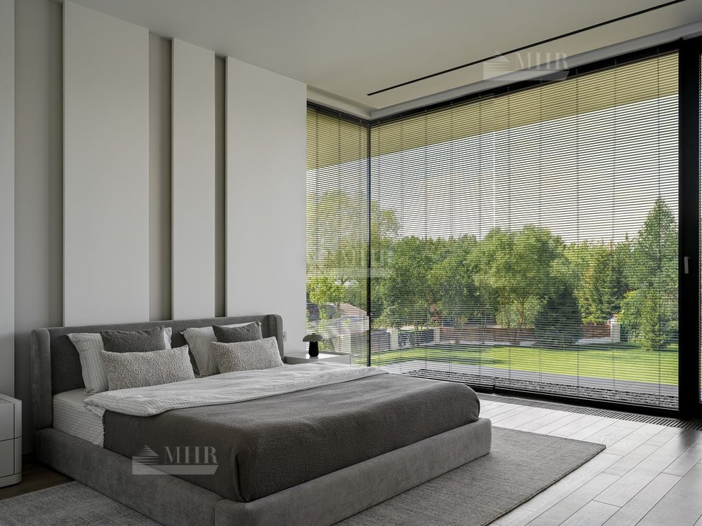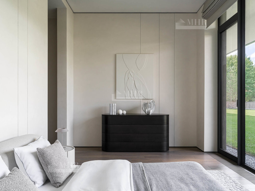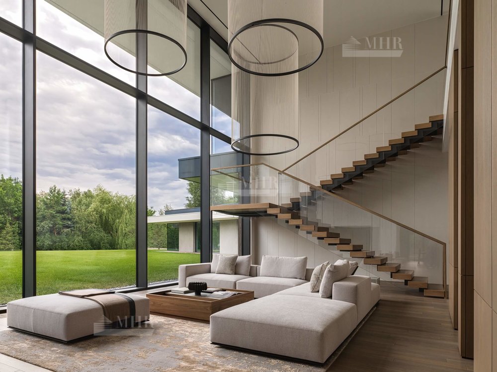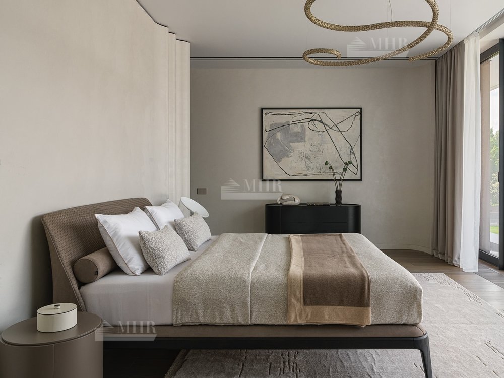 2-й этаж: просторная галерея, мастер-блок: спальня с панорамными окнами и просторная гардеробная, две ванные комнаты, спальня с выходом на балкон, с ванной и гардеробом, спальня с угловым панорамным окном, ванной и гардеробом, спальня с панорамным окном, с ванной и гардеробом.