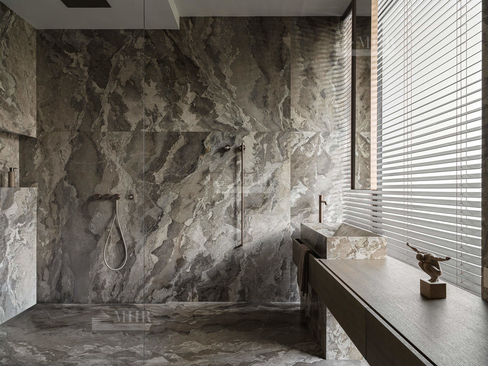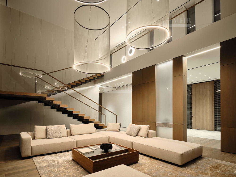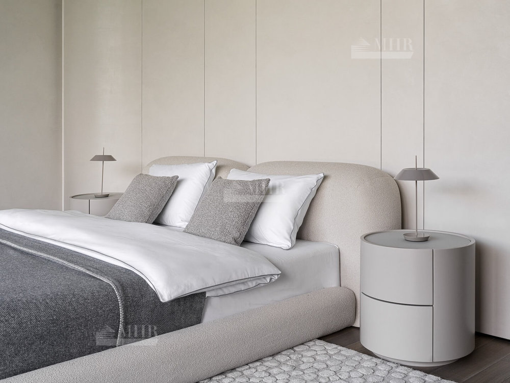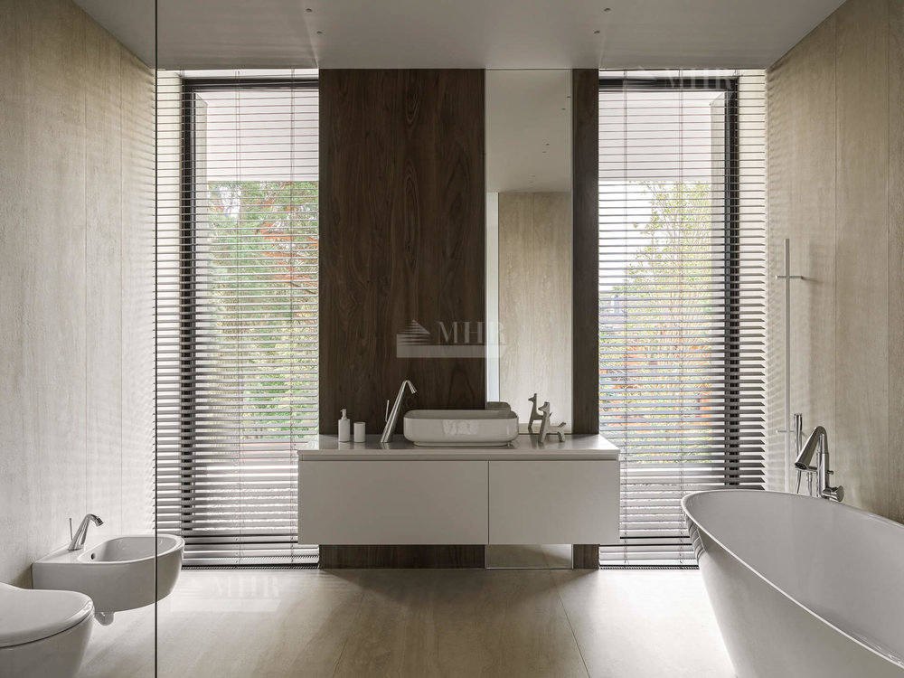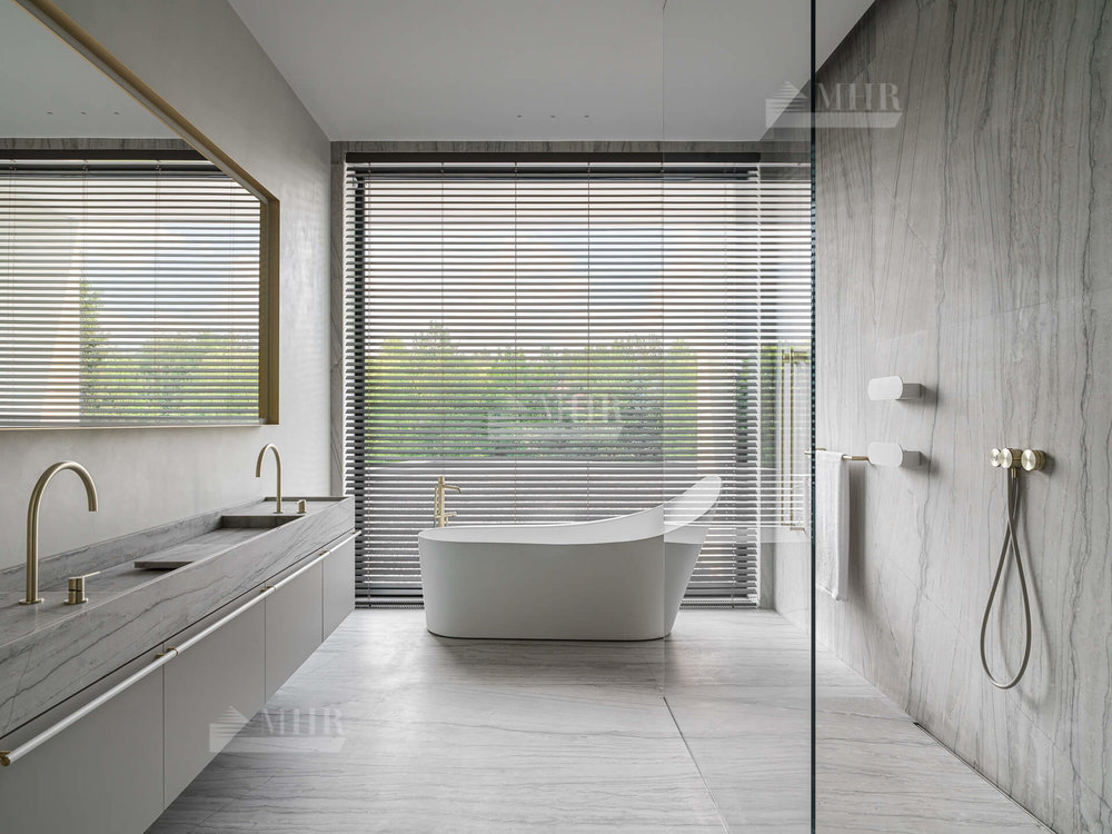 2-й этаж: просторная галерея, мастер-блок: спальня с панорамными окнами и просторная гардеробная, две ванные комнаты, спальня с выходом на балкон, с ванной и гардеробом, спальня с угловым панорамным окном, ванной и гардеробом, спальня с панорамным окном, с ванной и гардеробом.