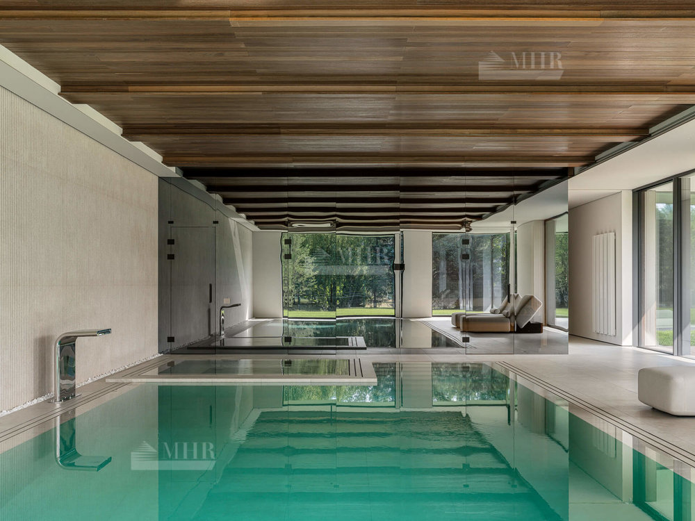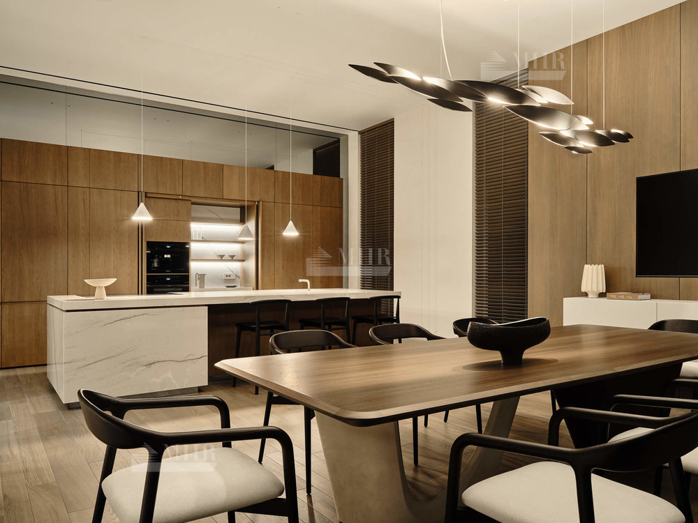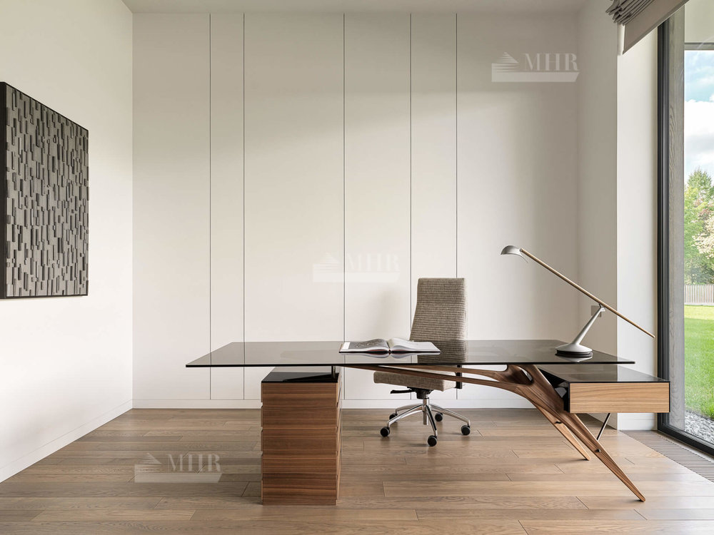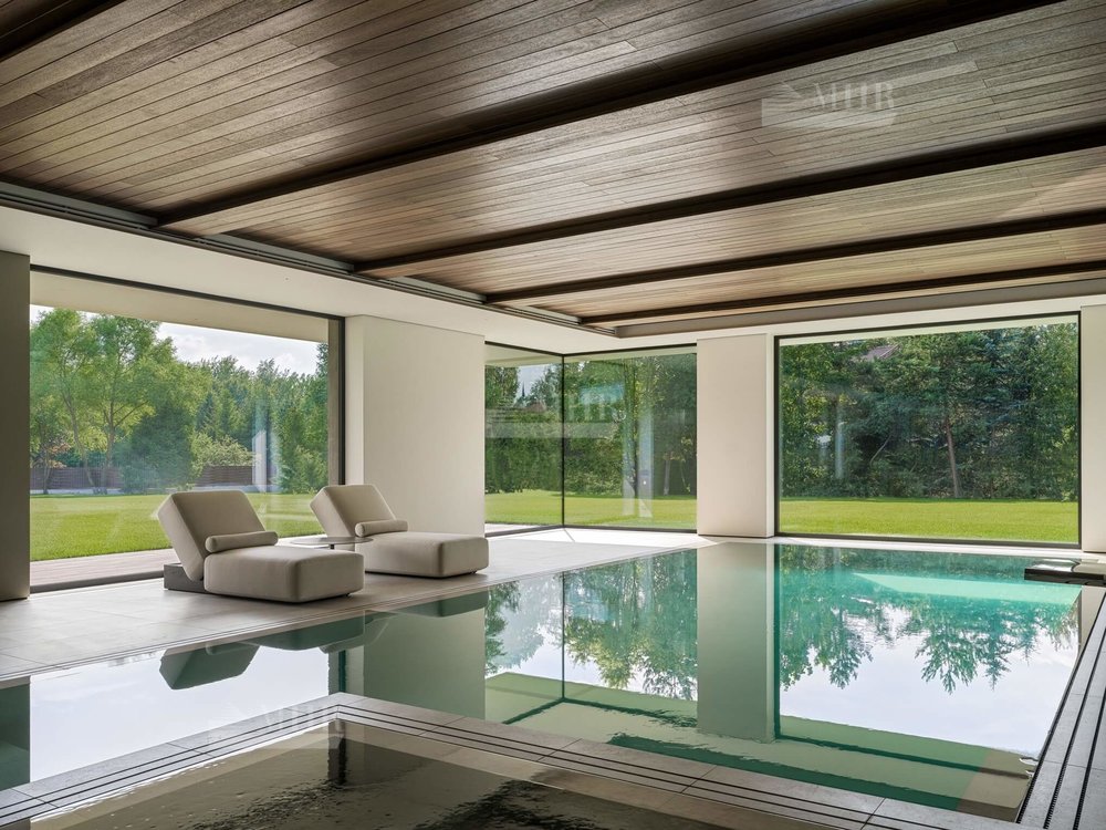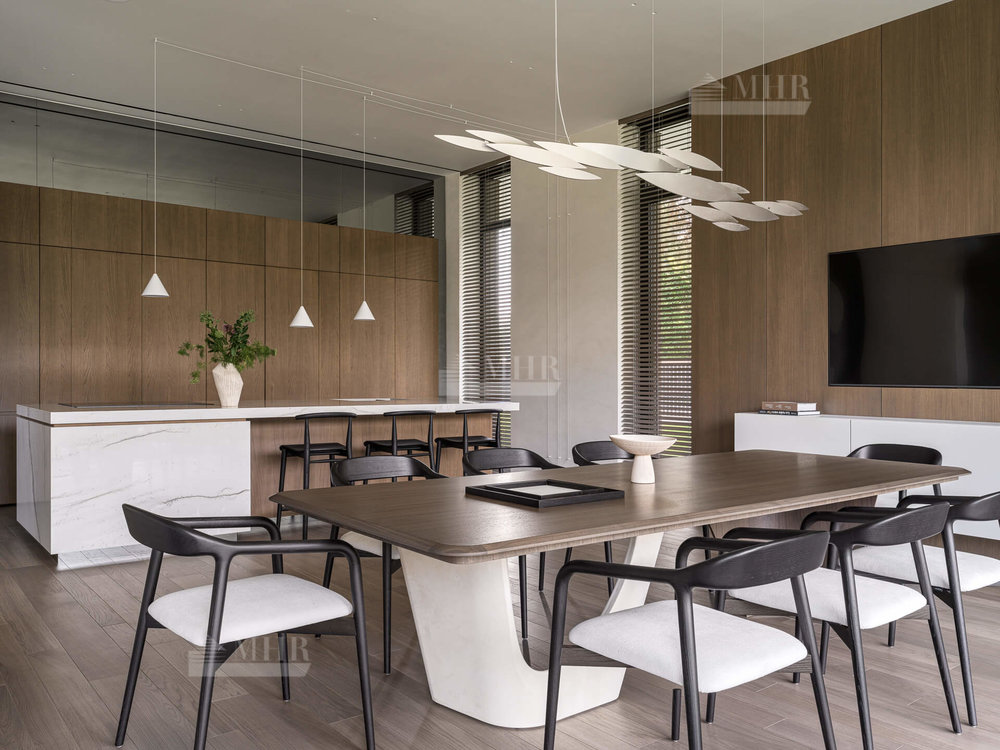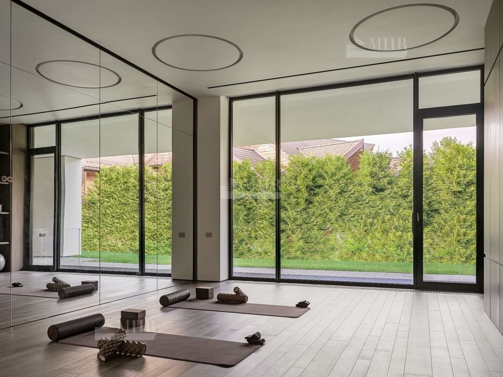1-й этаж: прихожая с гардеробной, гостиная со вторым светом и двусторонним камином, столовая с выходом на террасу, парадная кухня с огромным островом и зоной завтрака на 4 посадочных места, техническая кухня с отдельным входом с улицы, винная или сигарная комната, кабинет, гостевая спальня с гардеробом и ванной комнатой, хобби-комната, гараж, с/у с техническим душем, терраса. Спа-комплекс: бассейн с выходом на террасу, сауна, хаммам, массажный кабинет и раздевалка с душем, с/у.