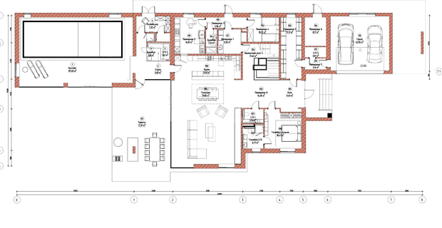 Цокольный этаж: блок персонала с естественным освещением, кухня, с/у, 2 спальни, технические помещения - 2 бойлерные, электрощитовая, постирочная,, венткамера и тех. помещение бассейна.