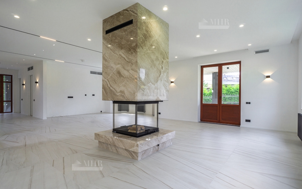 - 1-й этаж: холл/прихожая, гостевой санузел, гардеробная, просторное объединенное пространство кухни и столовой с выходом на террасу, гостиная с дровяным камином. Гараж на два машиноместа.