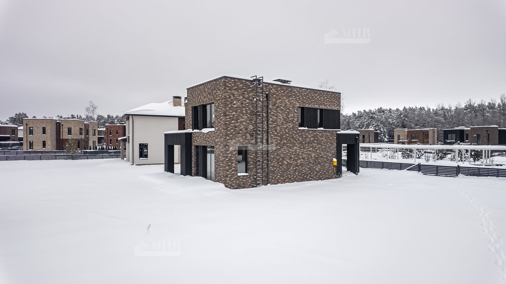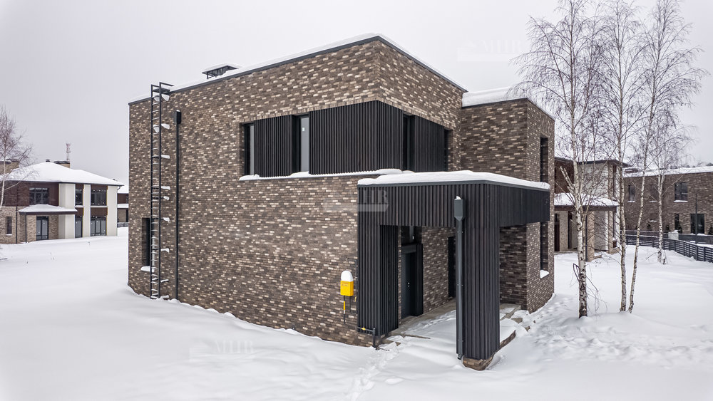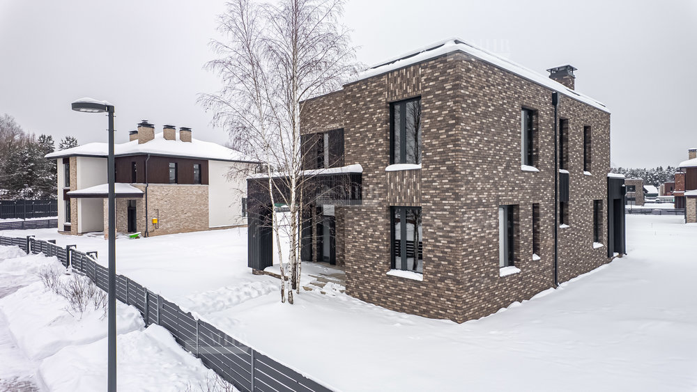 Архитектура дома выполнена в современном стиле с элементами скандинавского подхода- с четкой геометрией объемов и выверенными пропорциями. Фасад  сочетает клинкерный кирпич и натуральную лиственницу, формируя спокойный, лаконичный образ. Большая площадь остекления усиливает связь дома с природным окружением и наполняет внутренние помещения естественным светом.