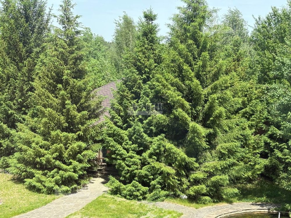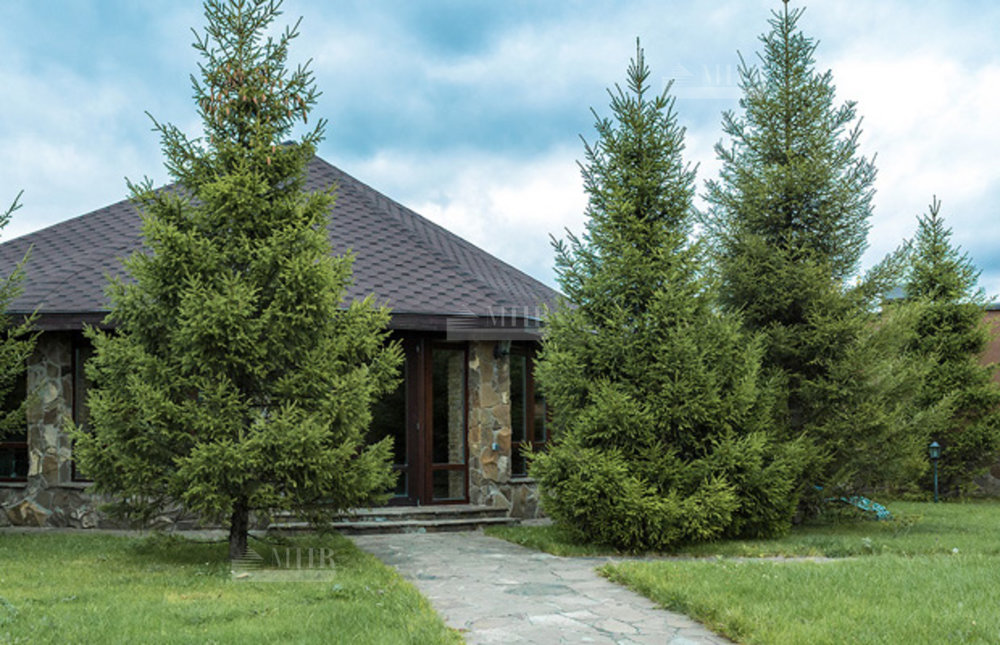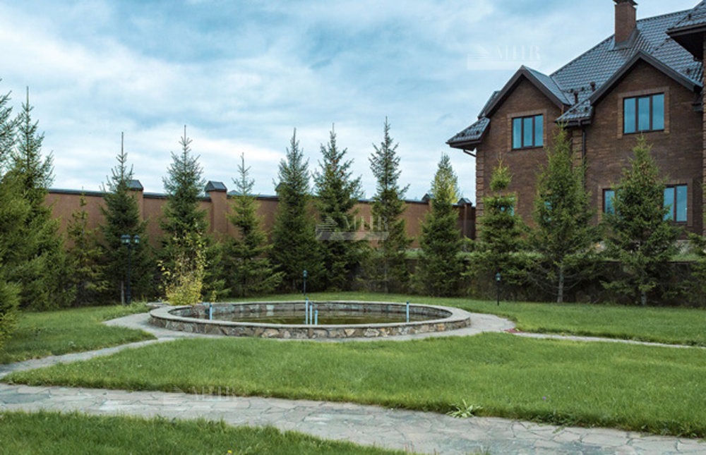 На участке выполнены ландшафтные работы, вымощены дорожки, проведено освещение, газон, хвойные деревья и фонтан.