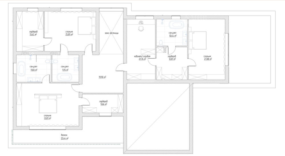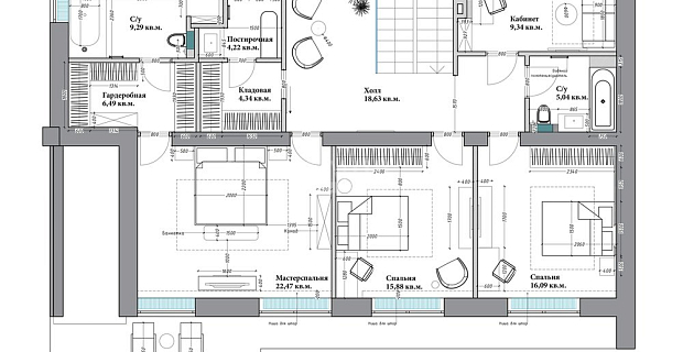 2 этаж: Мастер-спальня с ванной комнатой и гардеробной, две спальни с индивидуальными санузлами и гардеробными, кабинет/спальня и отдельная гардеробная