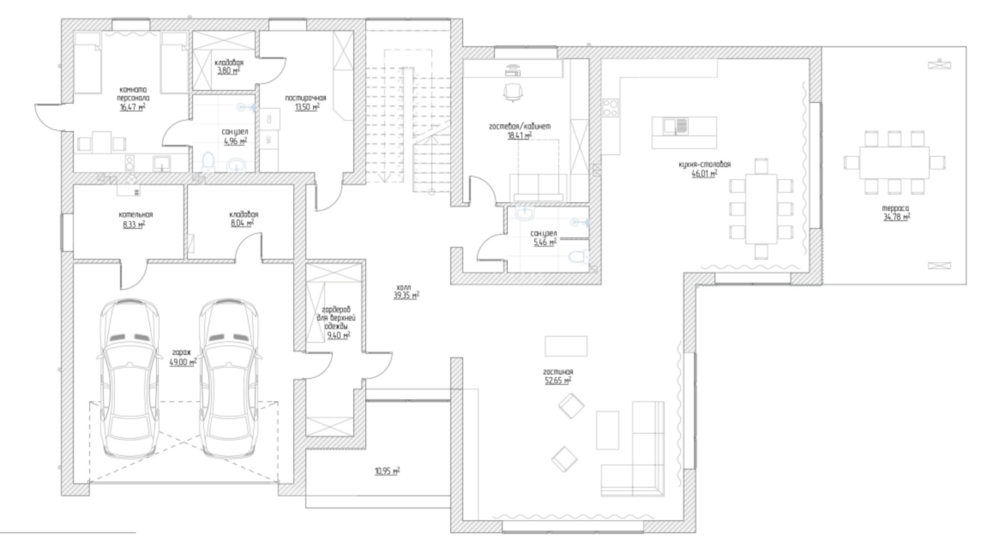 1 этаж: Парадная входная группа, гардеробная, просторный холл, спальня, гостевой санузел, кухня-столовая с выходом на террасу, гостиная, кладовая, постирочная, комната хранения, котельная, гараж на два автомобиля, а также отдельный блок для персонала со всеми удобствами