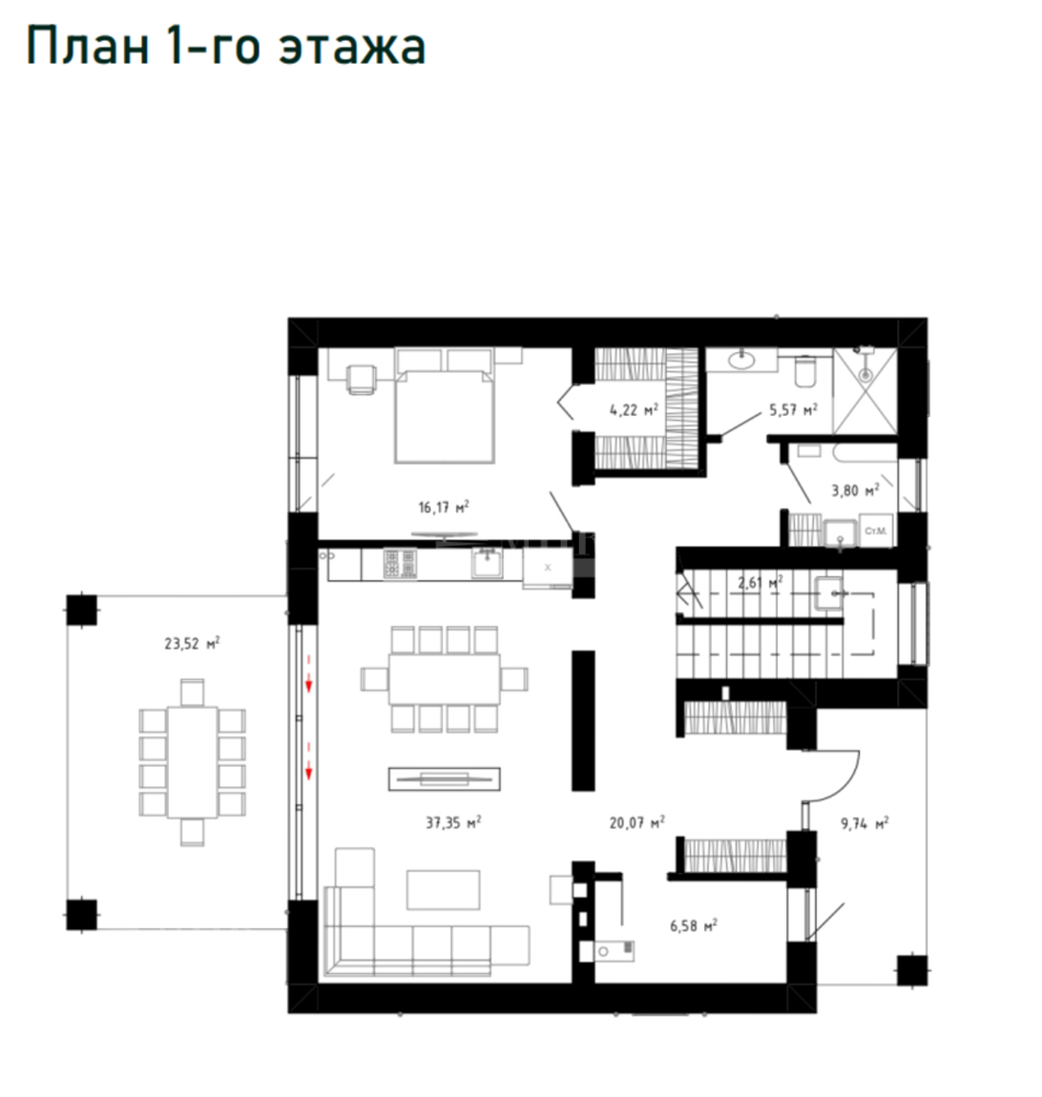 1й этаж: кухня, гостиная-столовая, спальня с с/у и гардеробной, постирочная, терраса;