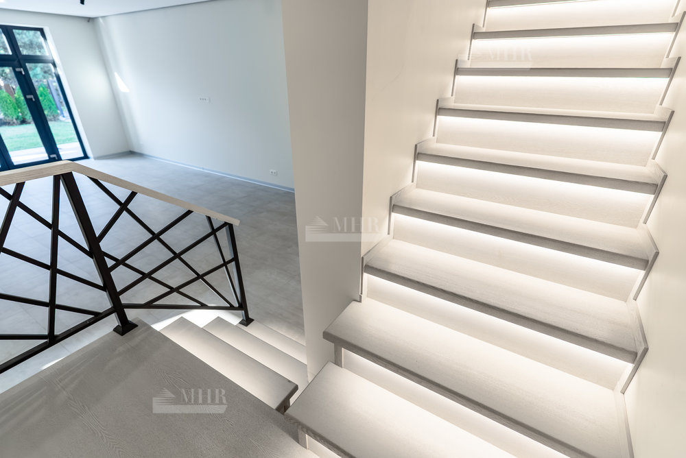 1й этаж: кухня с выходом на террасу, кабинет, спальня с санузлом, постирочная, гостевой туалет, котельная и гараж на два автомобиля;