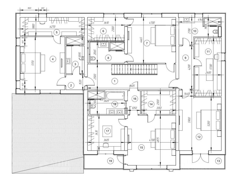 2й этаж: четыре спальни, каждая со своей гардеробной и ванной комнатой, мастер-блок — с балконом.