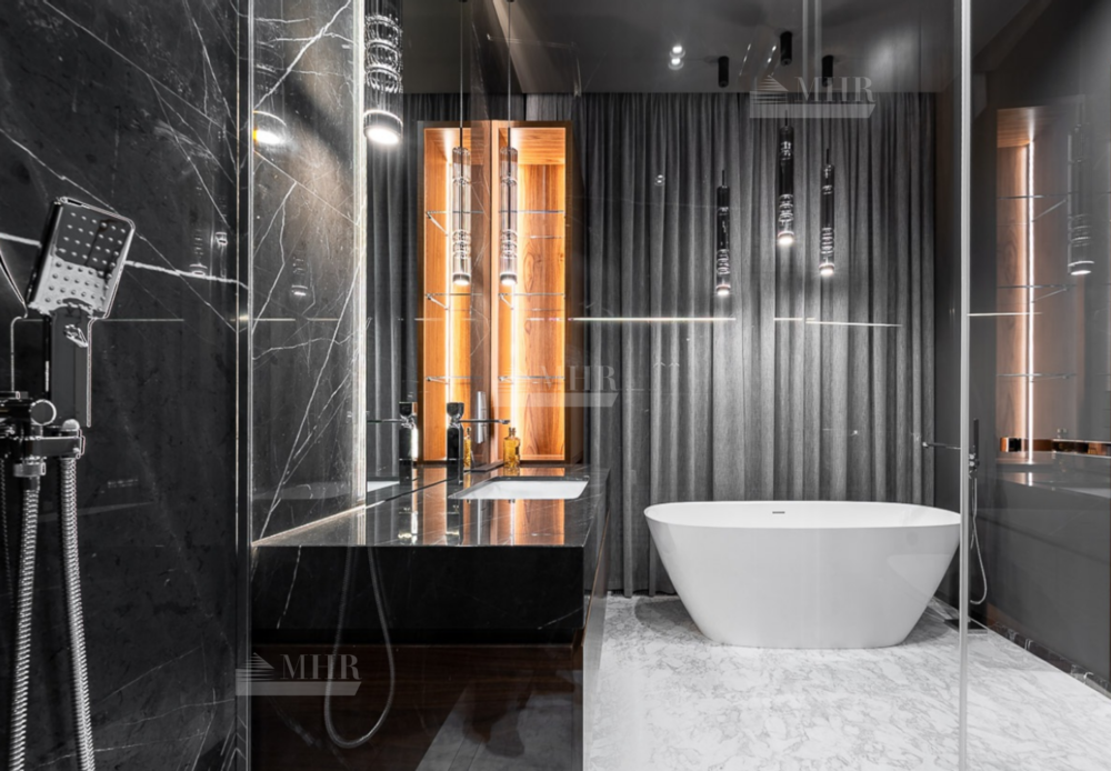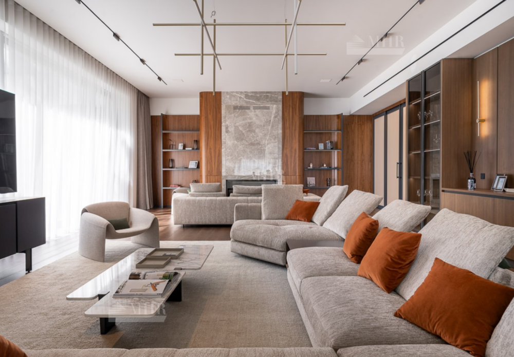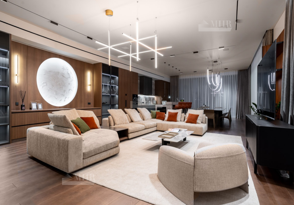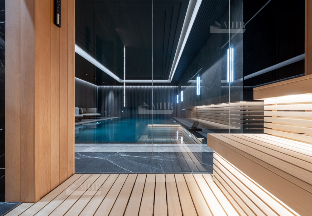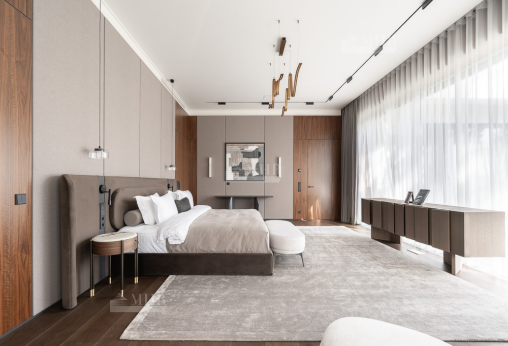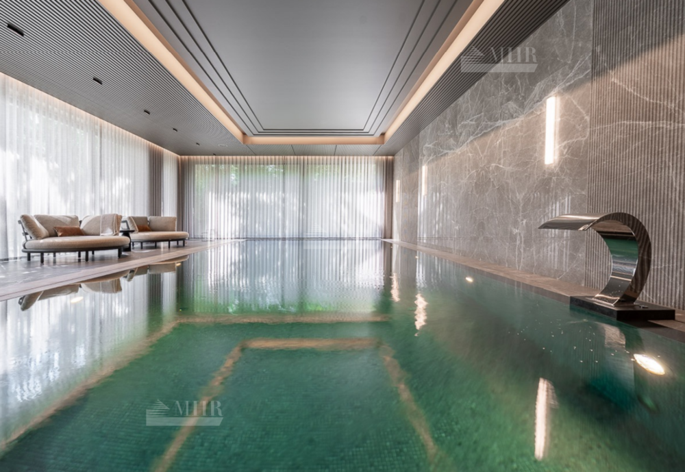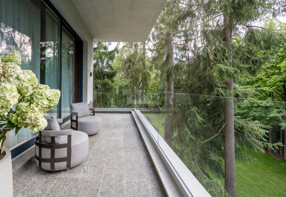 В доме пять спальных блоков со своими гардеробными комнатами и санузлами, несколько открытых балконов и террас, квартира для персонала, гараж на три автомобиля, зона СПА с сауной, переливной бассейн, подсобные и обслуживающие помещения, включая рабочую кухню, постирочную. В отделке использовались высоко качественные натуральные материалы, мрамор, дерево, мебель известных Итальянских брендов: Minotti, Paltrona Frau, Poliform, Porada. Бытовая кухонная техника Miele, стиральное и сушильное оборудование Asco.
