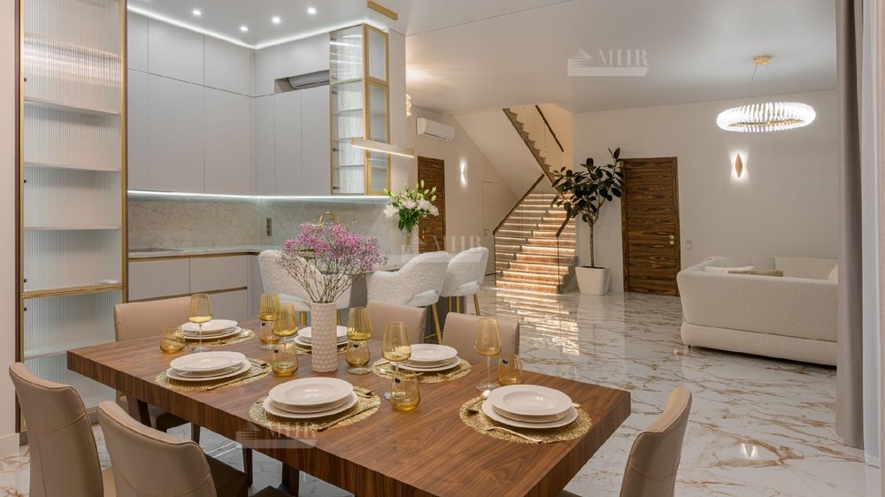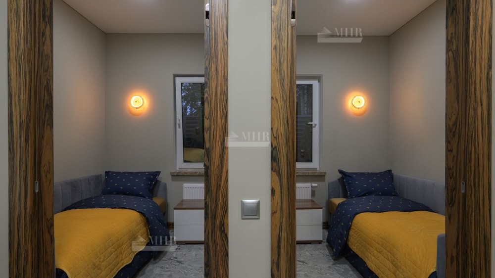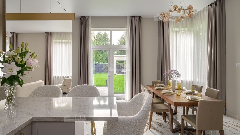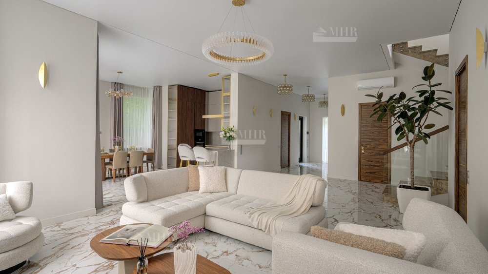 Дом полностью меблирован, отделка  выполнена с использованием высококачественных материалов - ценных пород дерева, шпона, натурального камня, мрамора, текстиль премиального качества, уровневое освещение, встроенная мебель индивидуального изготовления. Установлена система вентиляции с климат-контролем в каждом помещении. На участке располагается уютная беседка с зоной отдыха, а также отдельно стоящий гостевой дом с двумя спальнями и кухней. Есть все. Тихо, зелено.