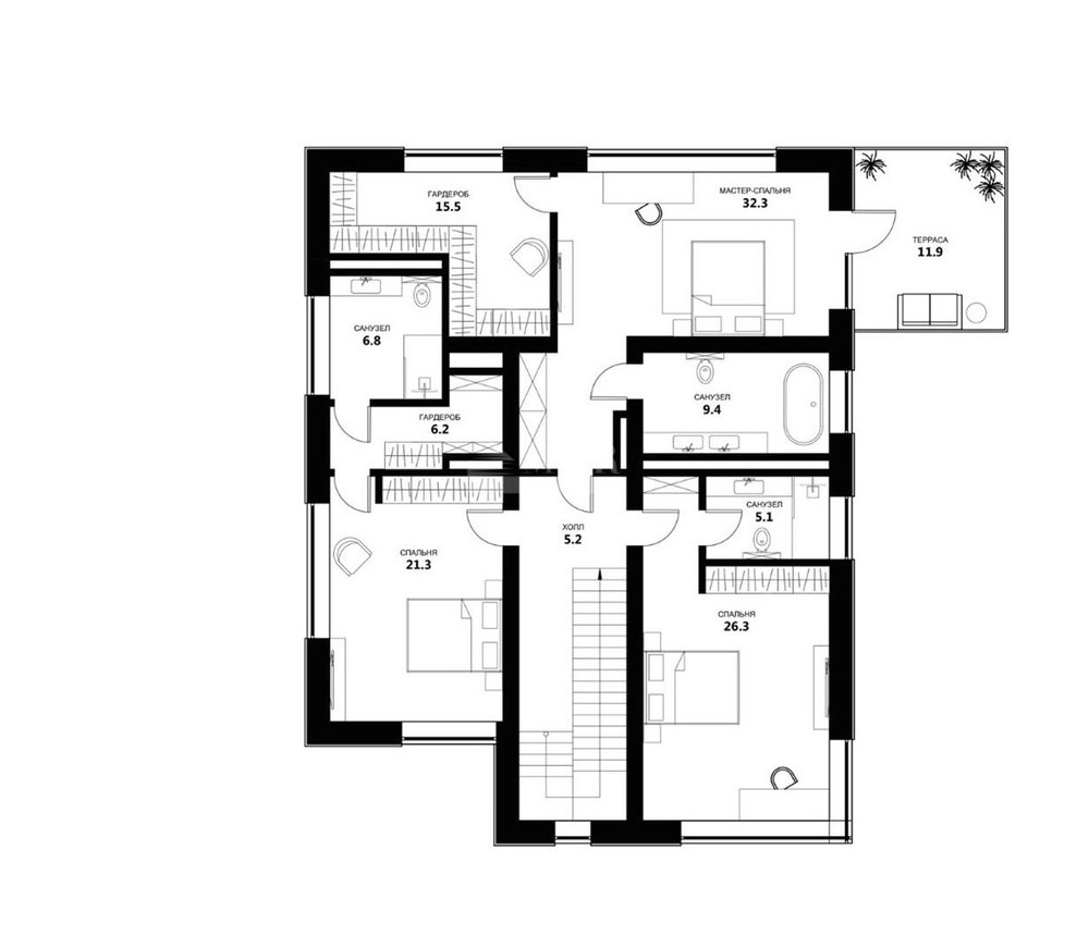 На втором этаже: три комфортные спальни, включая роскошную мастер-спальню. В каждой комнате индивидуальный санузел, что особенно ценно для семей с высокими требованиями к личному пространству