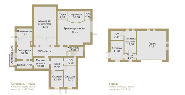 1 этаж: гараж на 2 м/м, прихожая, холл, кухня, столовая-гостиная, гостевая спальня, 2 с/у, сауна.