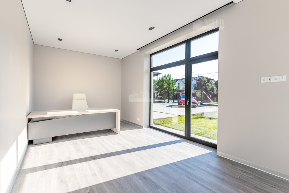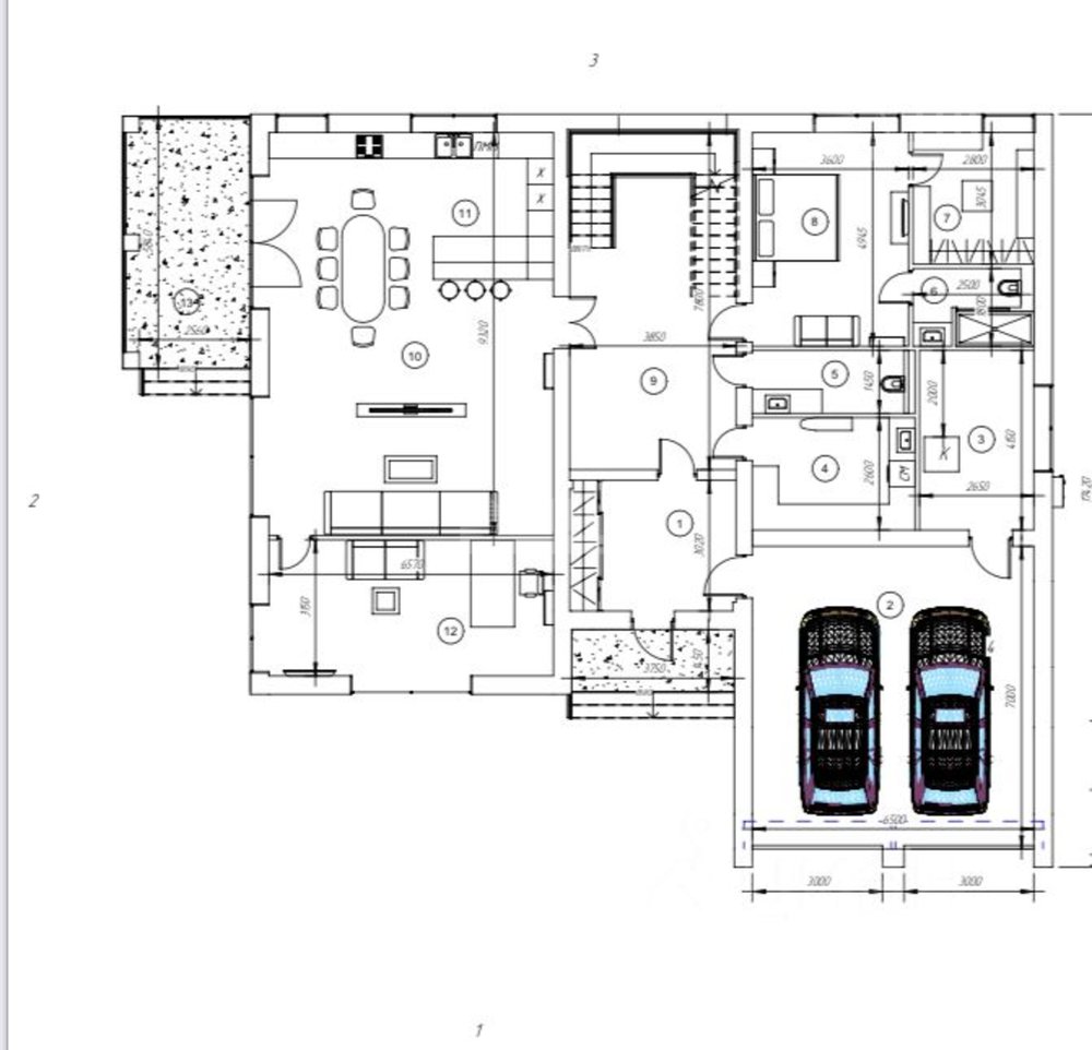 1й этаж: кухня с выходом на террасу, кабинет, спальня с санузлом, постирочная, гостевой туалет, котельная и гараж на два автомобиля;