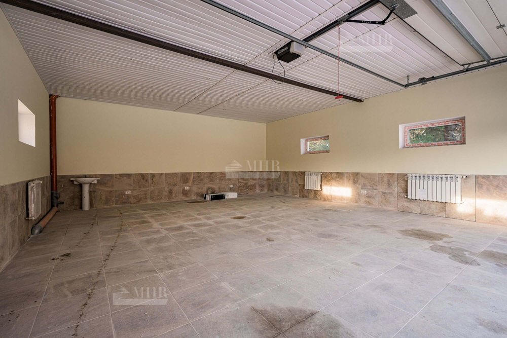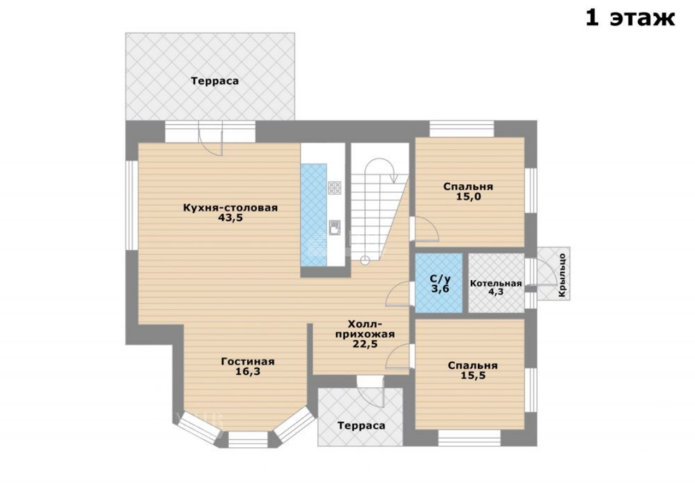 1 этаж: холл-прихожая 23 кв.м, гостиная-кухня-столовая 60 кв.м с выходом на крытую террасу 35 кв., котельная с отдельным входом, санузел, две спальни по 15 кв.м.