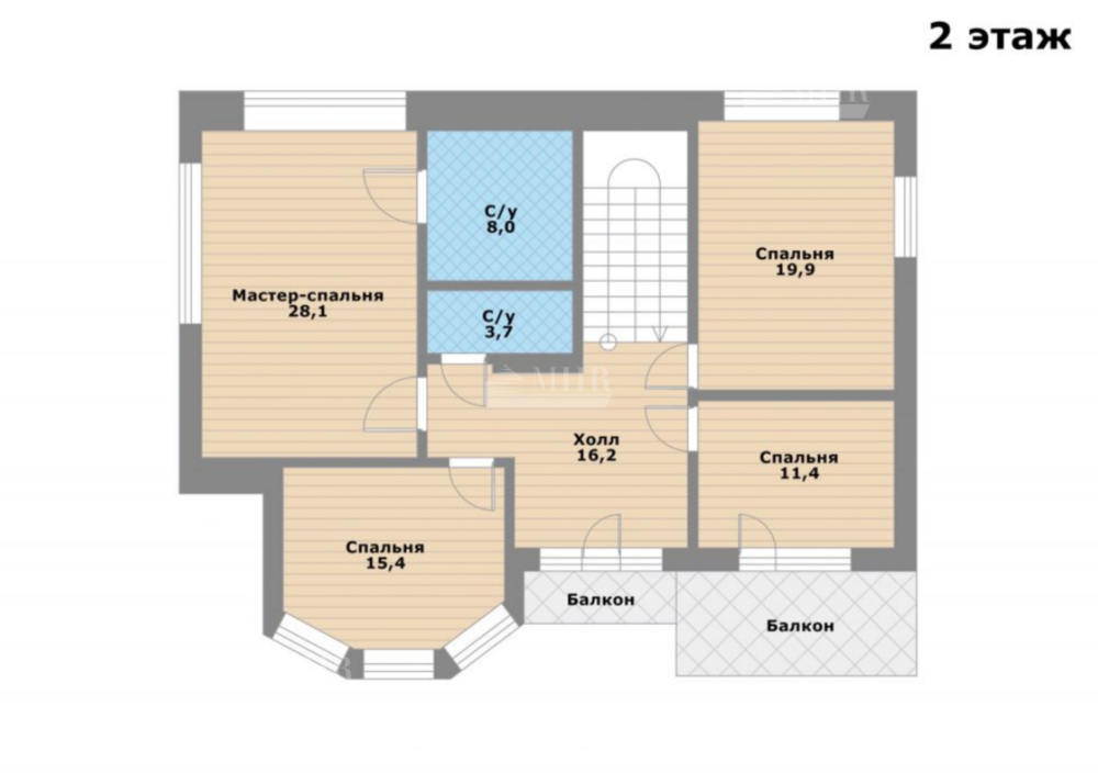 2 этаж: холл 16 кв.м с выходом на балкон, санузел, спальня 12 кв.м с балконом, спальни 20 кв.м и 15 кв.м, спальня 28 кв.м с санузлом 8 кв.м.