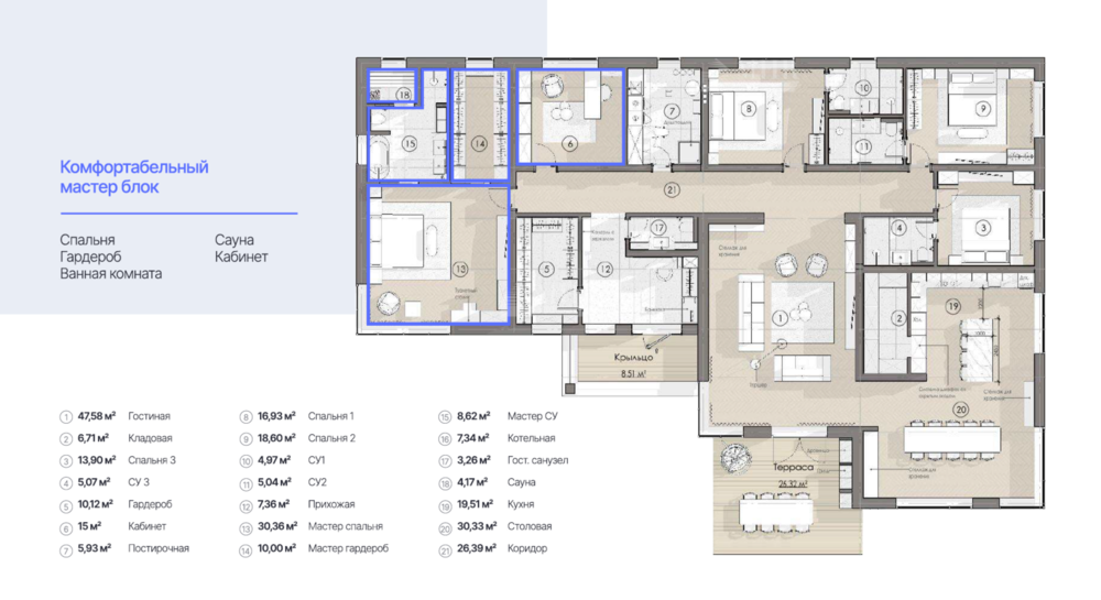 Планировка: гостиная, кладовая, 3 спальни с с/у, гардероб, кабинет, постирочная, прихожая, мастер-спальня с гардеробной и с/у , котельная, гостевой с/у, кедровая сауна, тропический душ, кухня, коридор, столовая.
