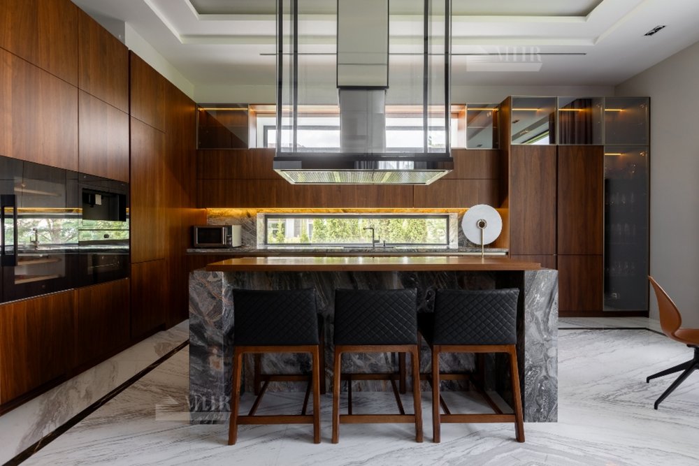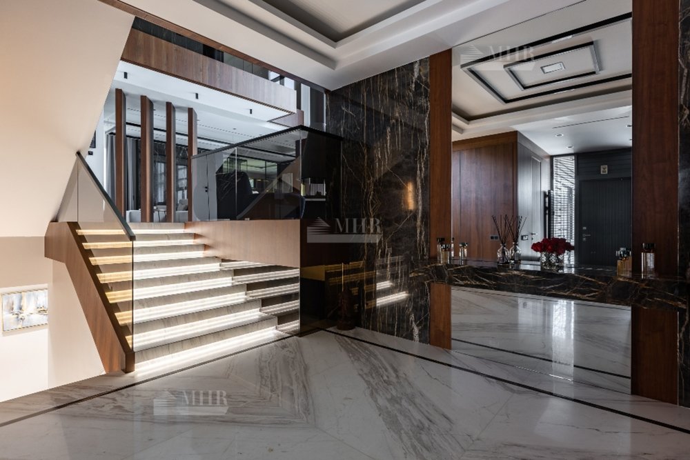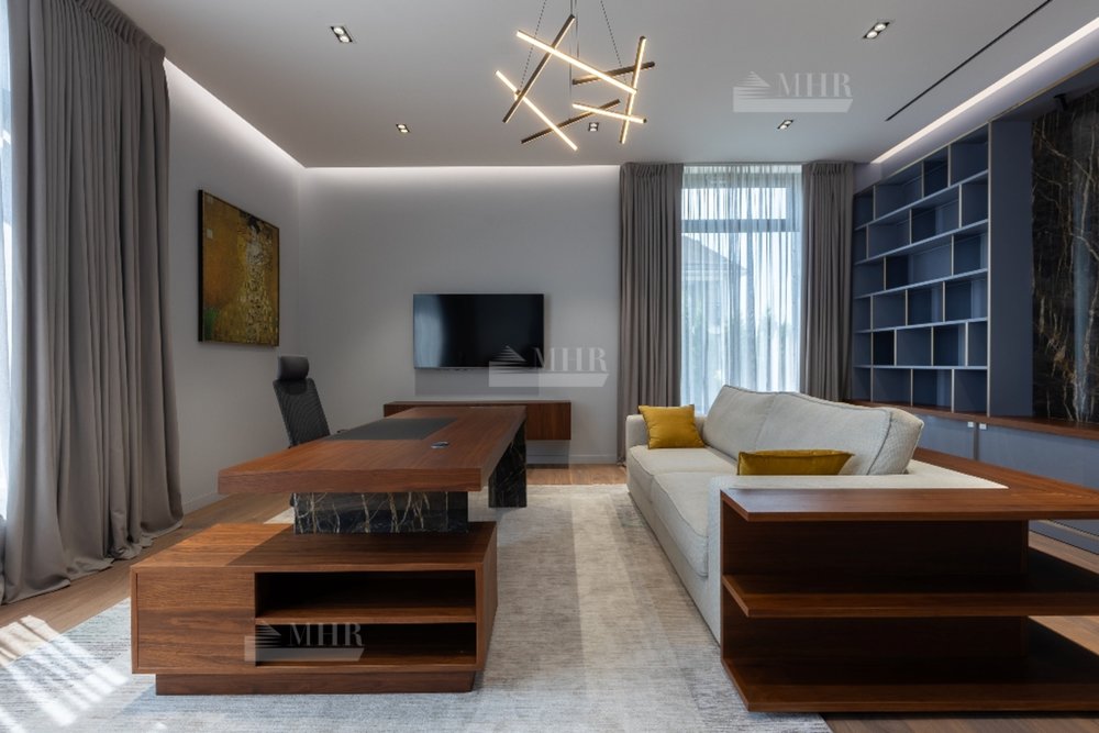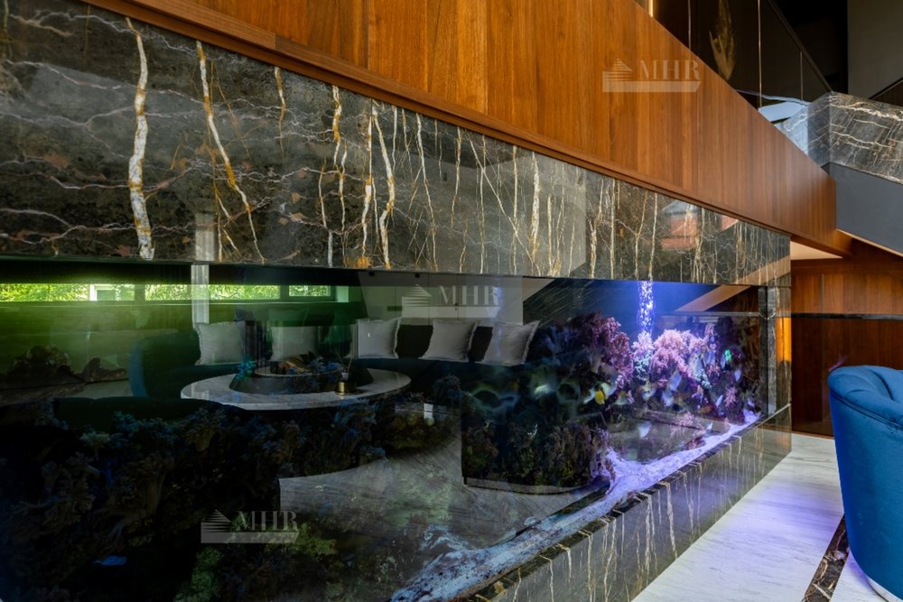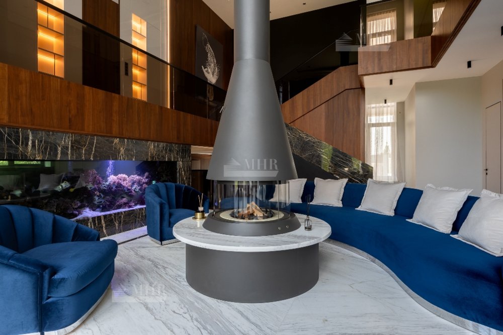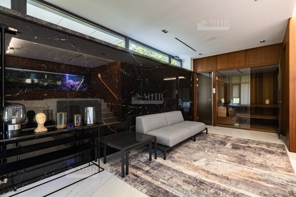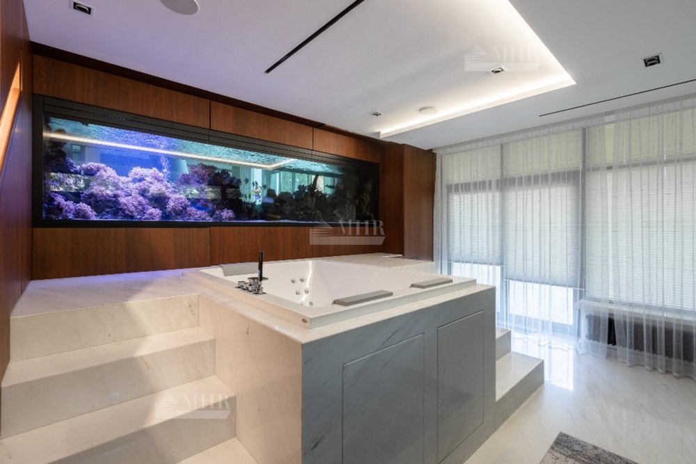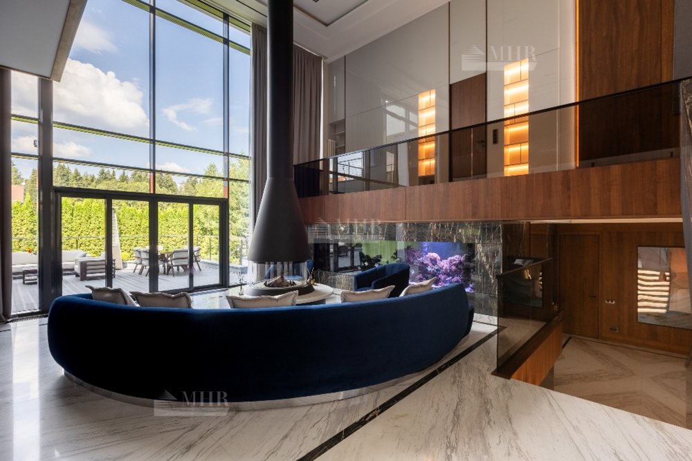 1-й этаж:  холл, гардеробная, с/у, СПА-зона: сауна, душевая, джакузи, выход на террасу, гостиная со вторым светом и аквариумом с выходом на террасу, кухня, столовая, кабинет, с/у;