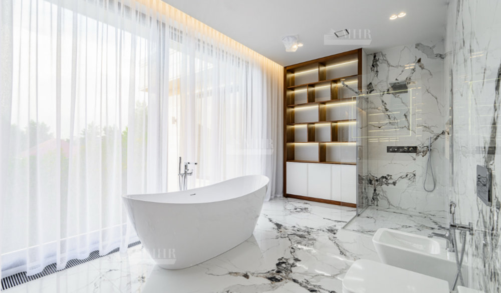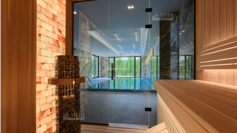 гостевой санузел, гостевая спальня с санузлом и гардеробной, кухня-столовая, гостиная с двухсторонним камином, кухня для приготовления, СПА зона с бассейном, сауной и