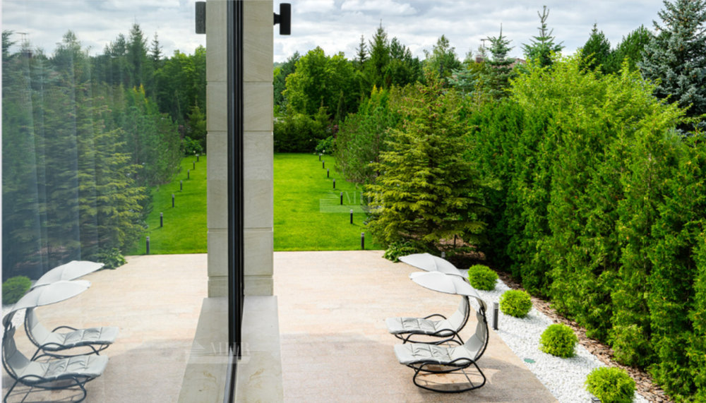 большие панорамные окна в пол из лиственницы. Установлена система приточно-вытяжной вентиляции с увлажнением и климат-контролем в