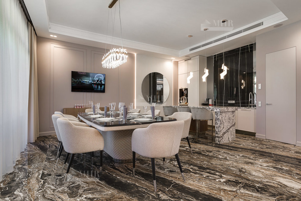 К продаже предлагается новый современный дом "под ключ" с мебелью, расположенный в тихой части поселка рядом с центральным озером и прогулочной зоной. Планировка коттеджа включает в себя: 6 спален со своими ванными комнатами и гардеробными, гостиную, столовую с выходом на крытую террасу, зону СПА с бассейном, тренажерный зал, кабинет, чистовую и рабочую кухни.