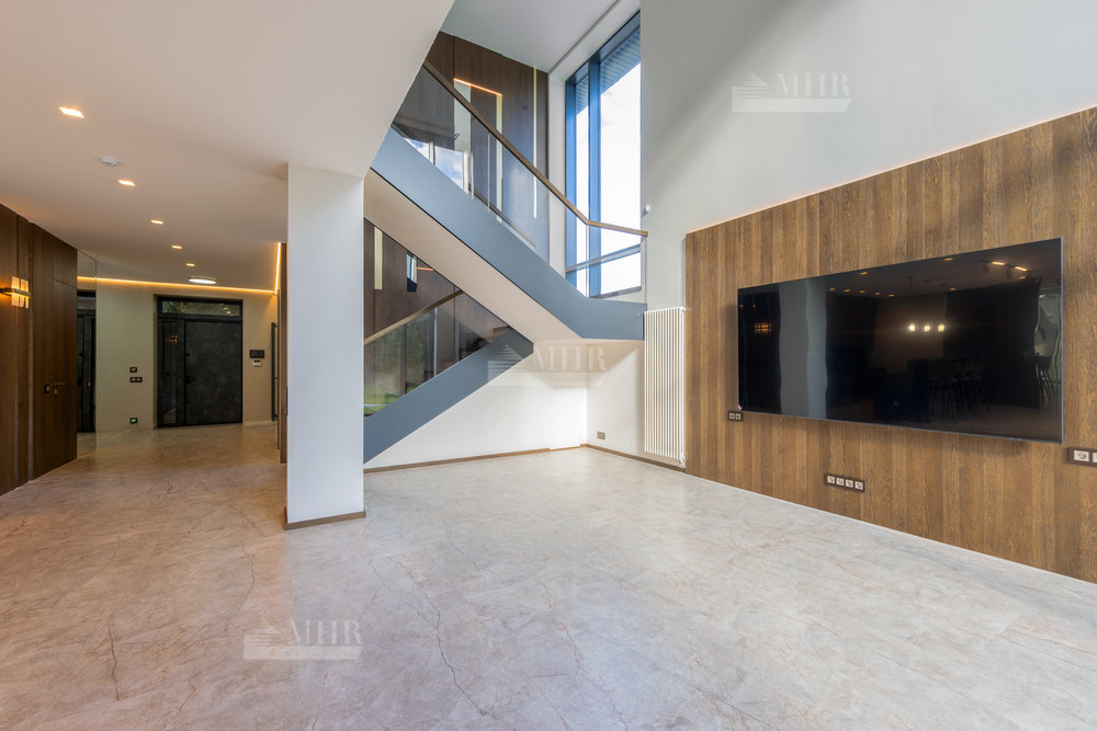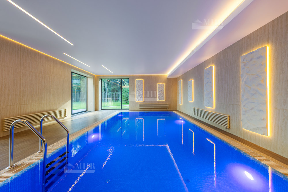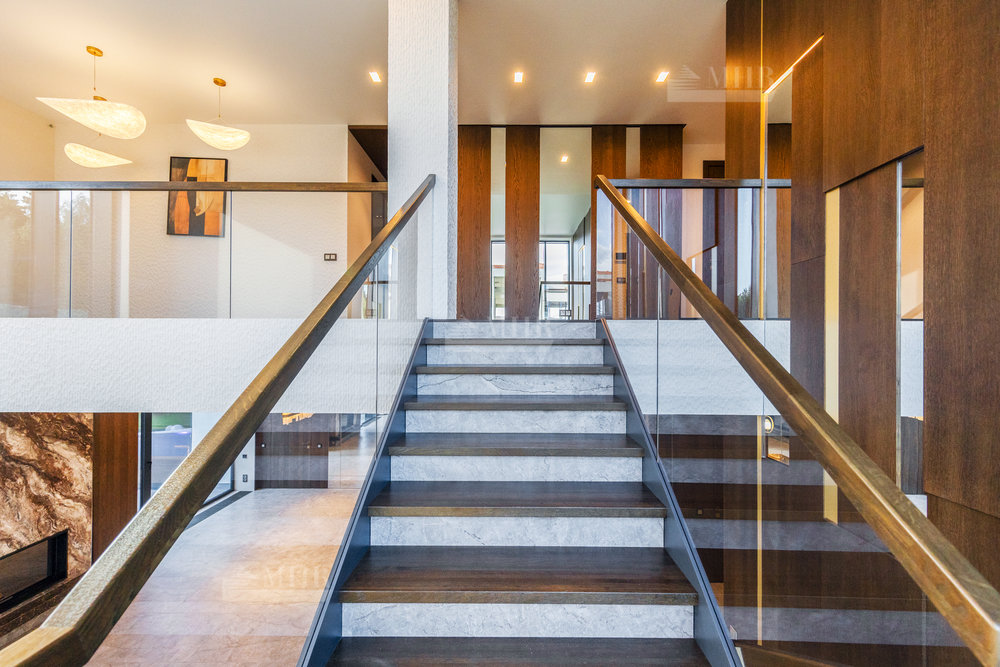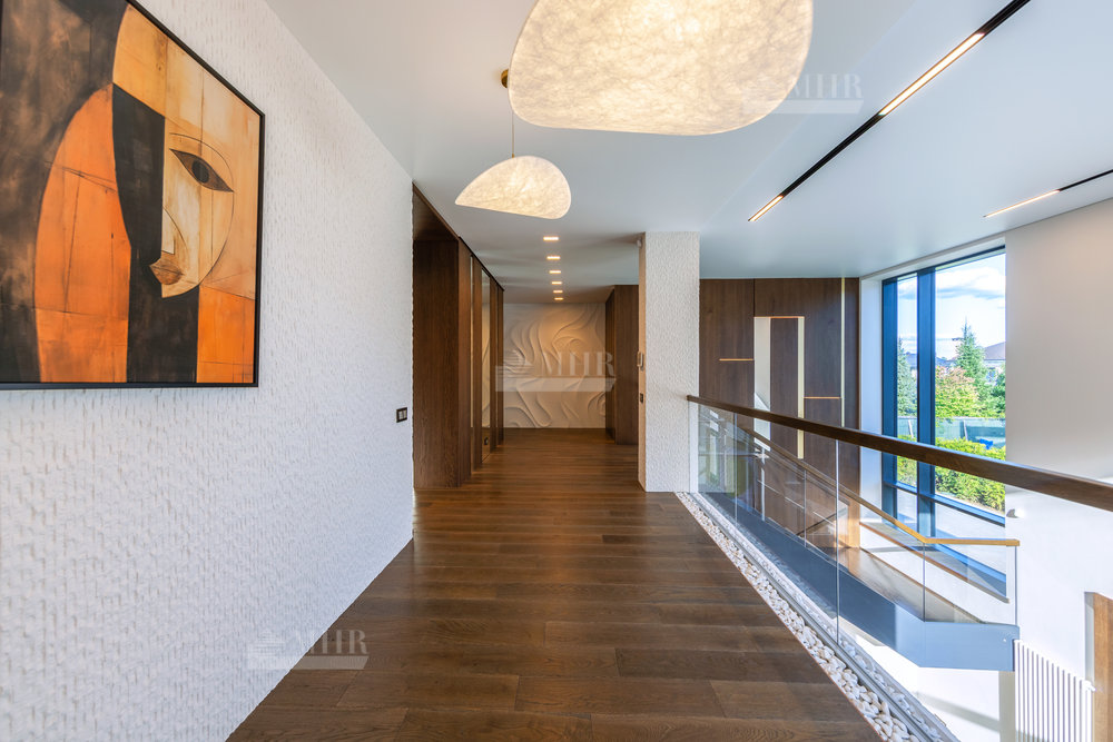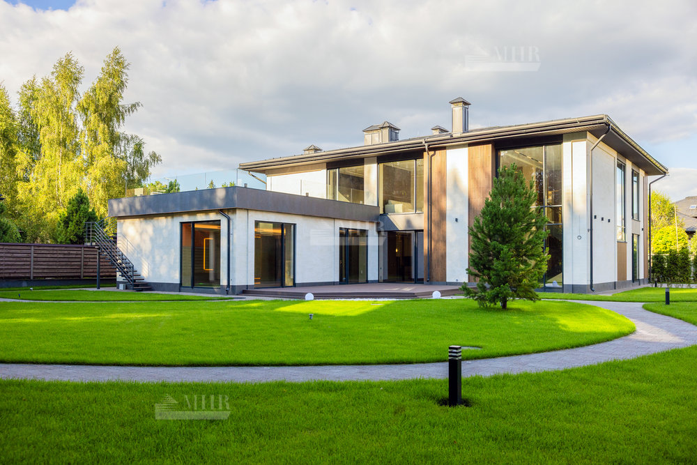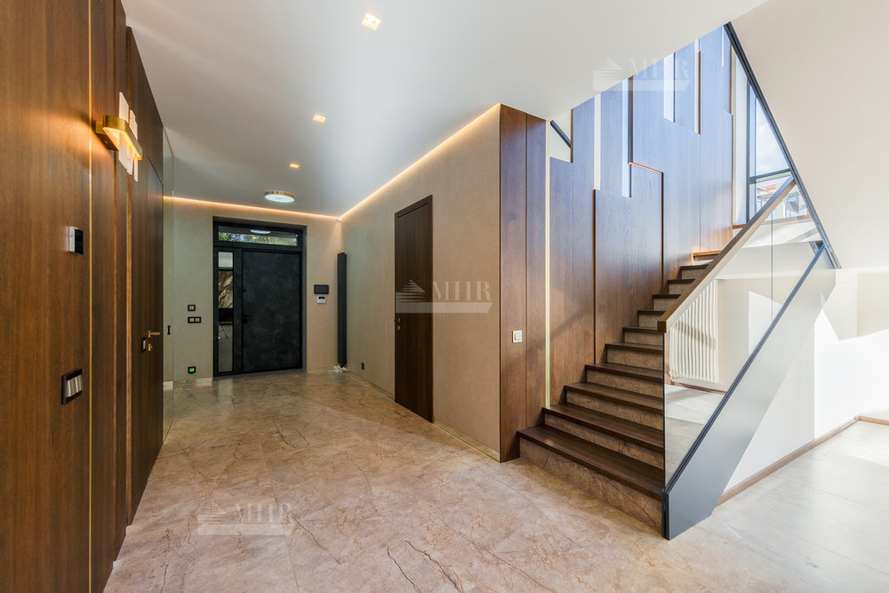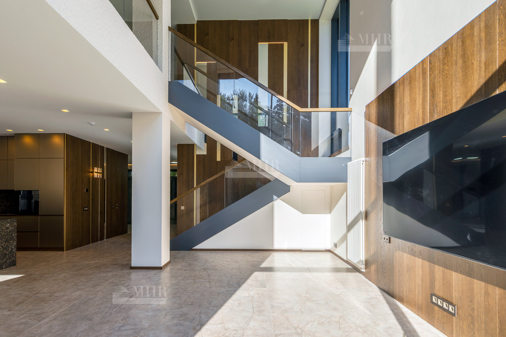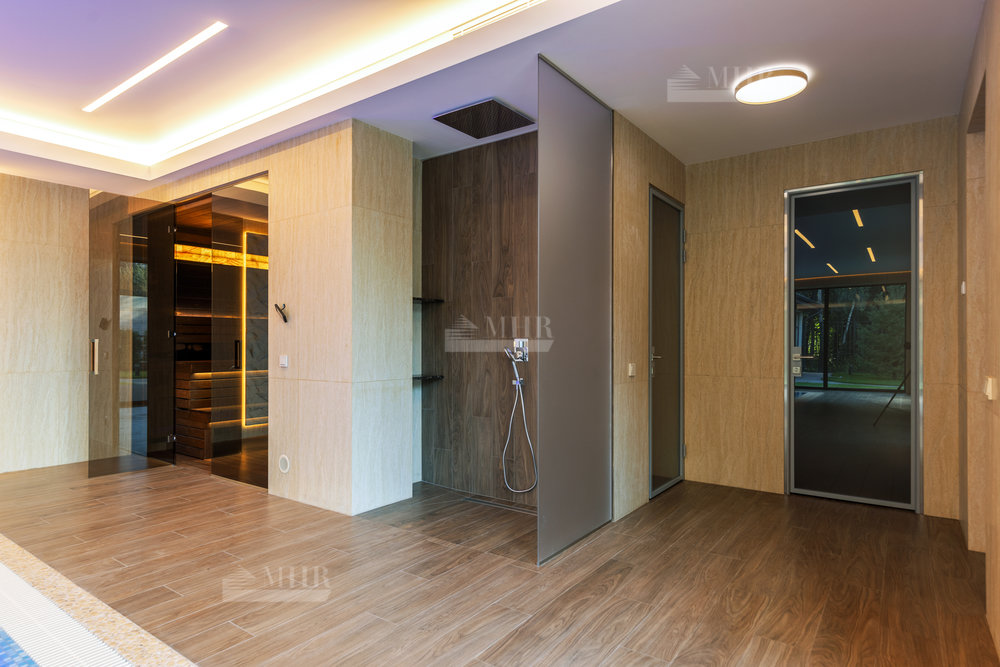 2-й этаж: холл, кабинет, мастер-спальня со своим с/у и гардеробной, спальня с с/у, квартира для персонала с отдельным входом из гаража, эксплуатируемая кровля над бассейном.