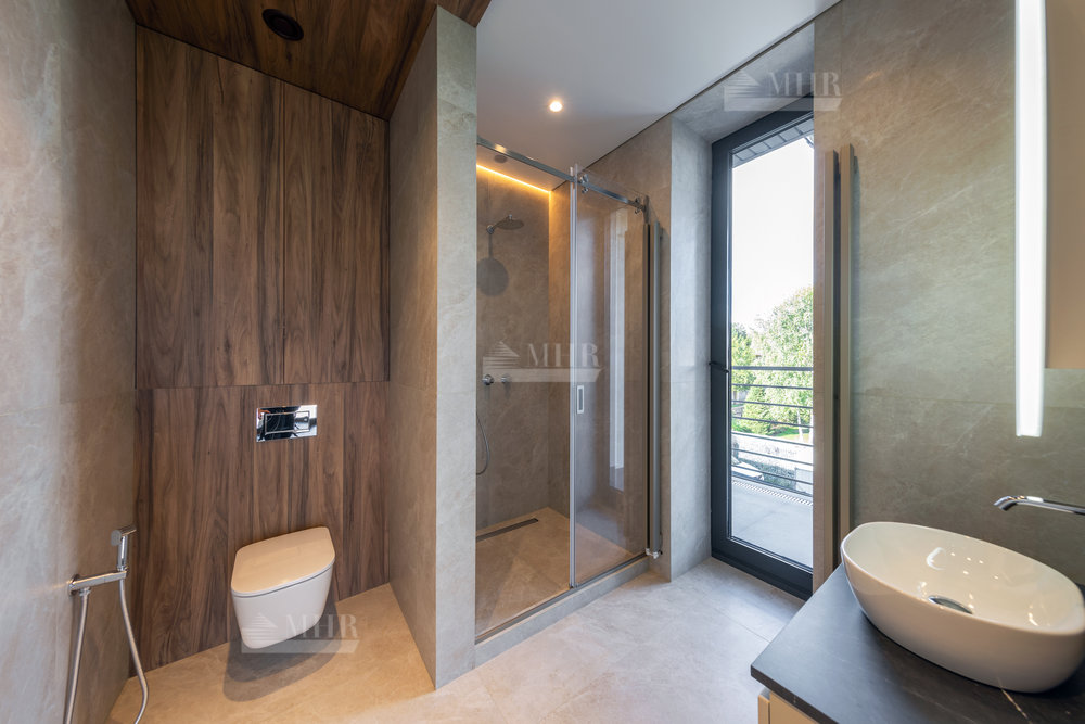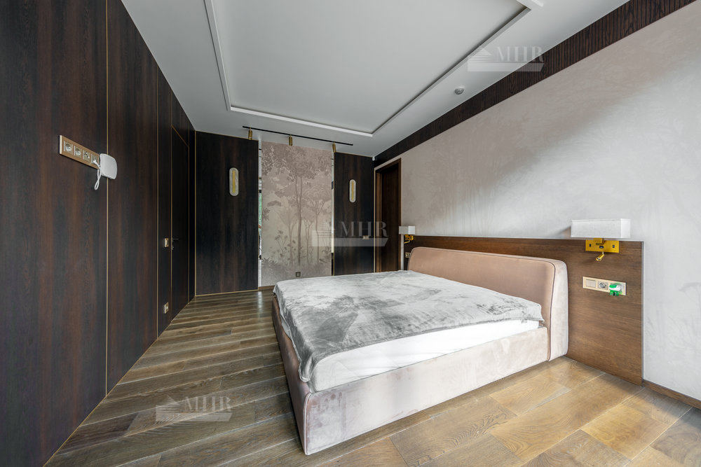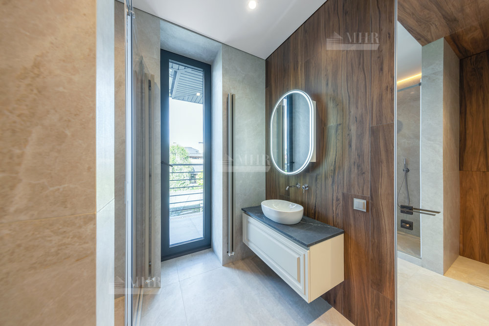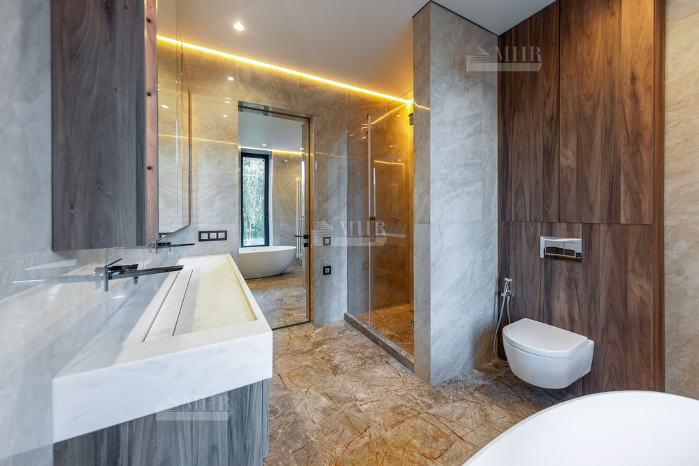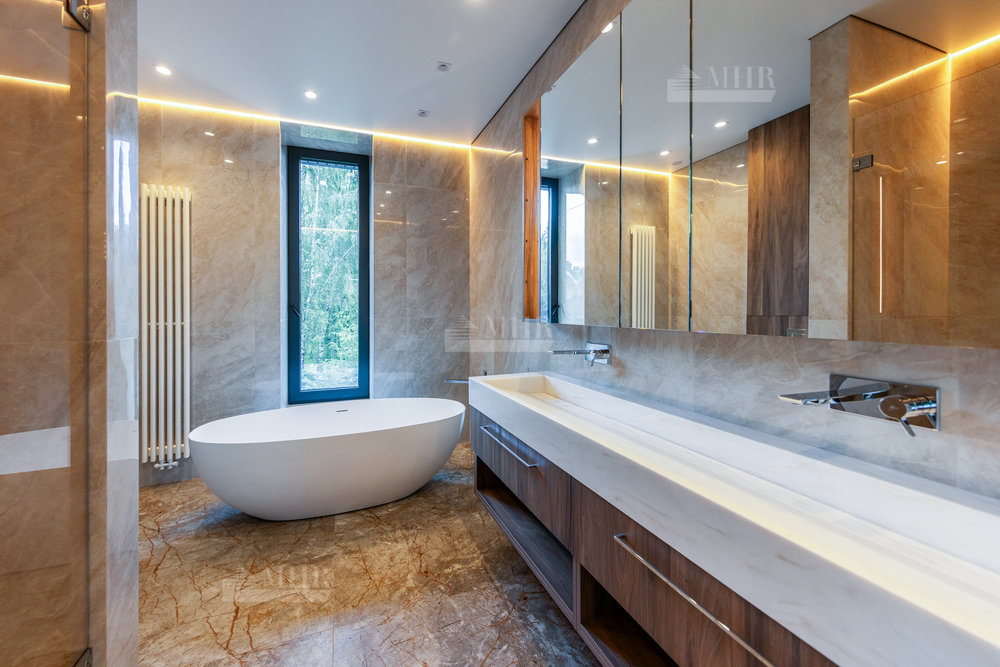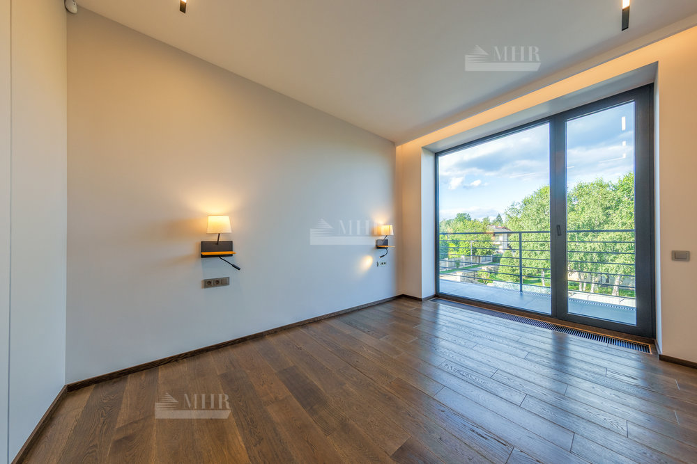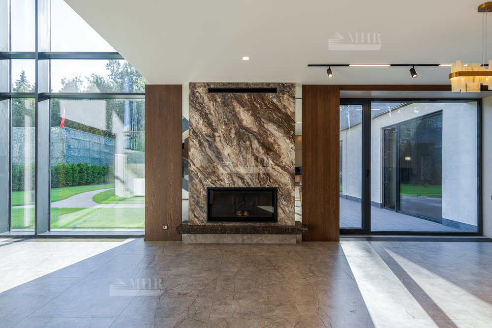 2-й этаж: холл, кабинет, мастер-спальня со своим с/у и гардеробной, спальня с с/у, квартира для персонала с отдельным входом из гаража, эксплуатируемая кровля над бассейном.