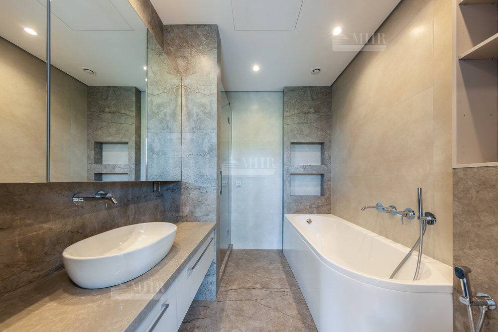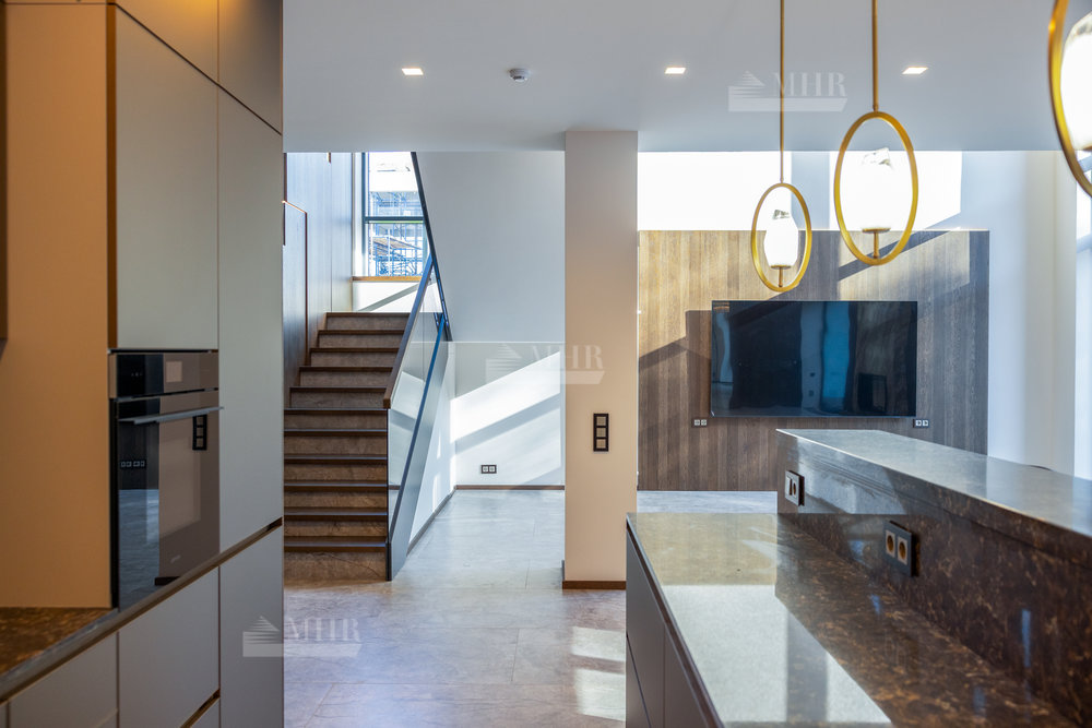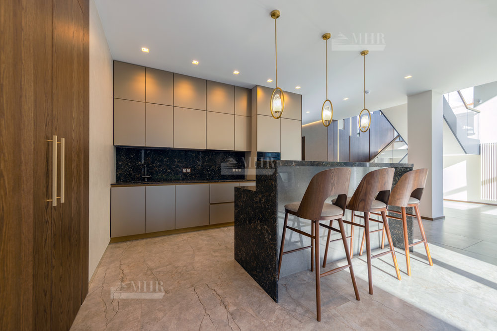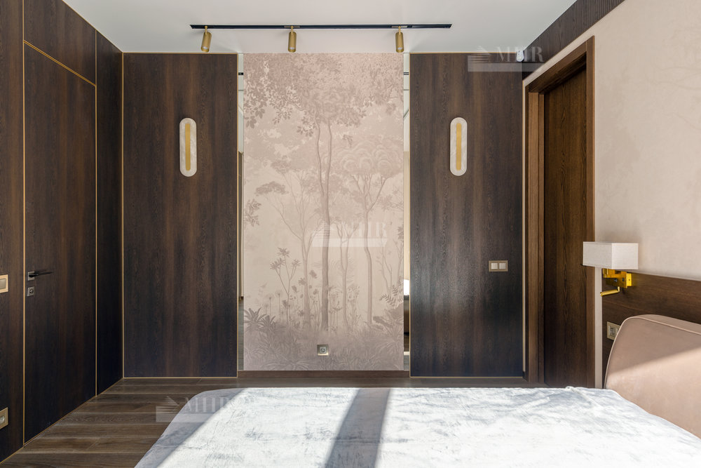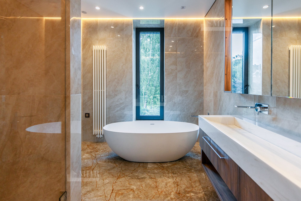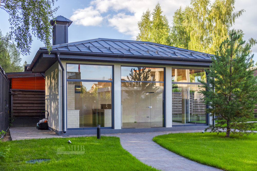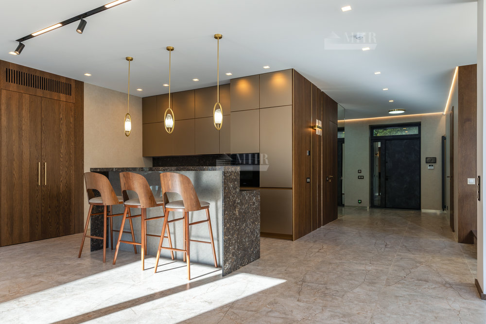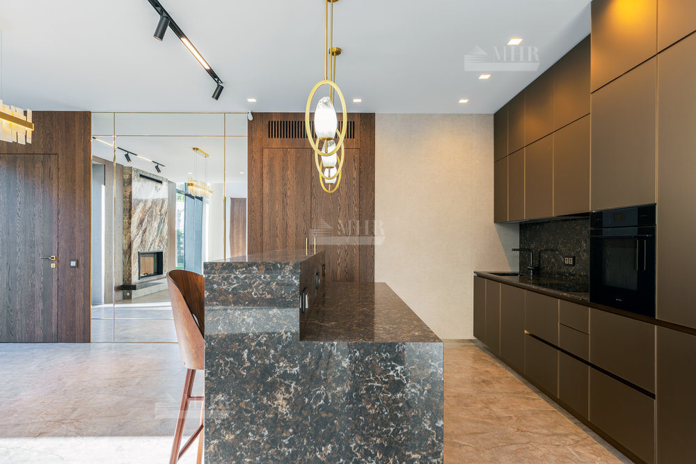 2-й этаж: холл, кабинет, мастер-спальня со своим с/у и гардеробной, спальня с с/у, квартира для персонала с отдельным входом из гаража, эксплуатируемая кровля над бассейном.