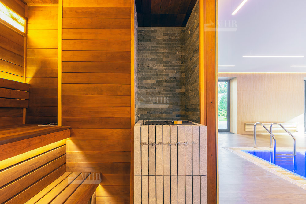 1-й этаж: просторная зона холла со встроенной гардеробной, с/у с душевой, гостевая спальня, кухня-столовая-гостиная, СПА-зона: бассейн, сауна, с/у, постирочная, гараж, бойлерная, кладовая;