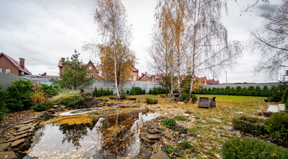 На огороженном участке с ландшафтным дизайном уложен газон, растёт множество взрослых деревьев. Есть красивый пруд с водопадом, кувшинками и рыбами. Дорожки вымощены камнем, сделан дренаж. Установлены автоматические ворота. Соседние дома уже построены на отдалении, что гарантирует тишину и создаёт приватную обстановку.