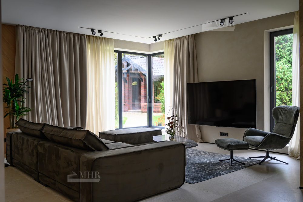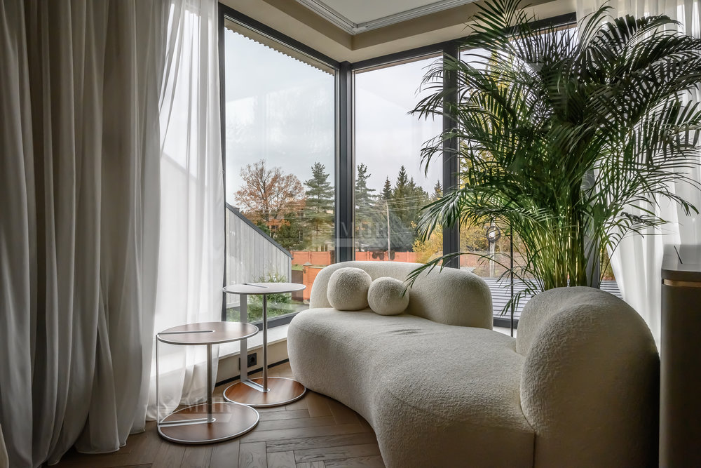 Панорамные окна, большая площадь остекления и высокие потолки делают дом очень светлым и просторным. Приточная вентиляция,