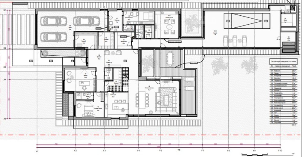 1 этаж: холл, гостиная- столовая, кухня, кабинет, гостевая спальня с с/у, санузел, СПА зона с бассейном, хаммамом, комнатой отдыха, с/у , гараж на 3 авто, блок для персонала