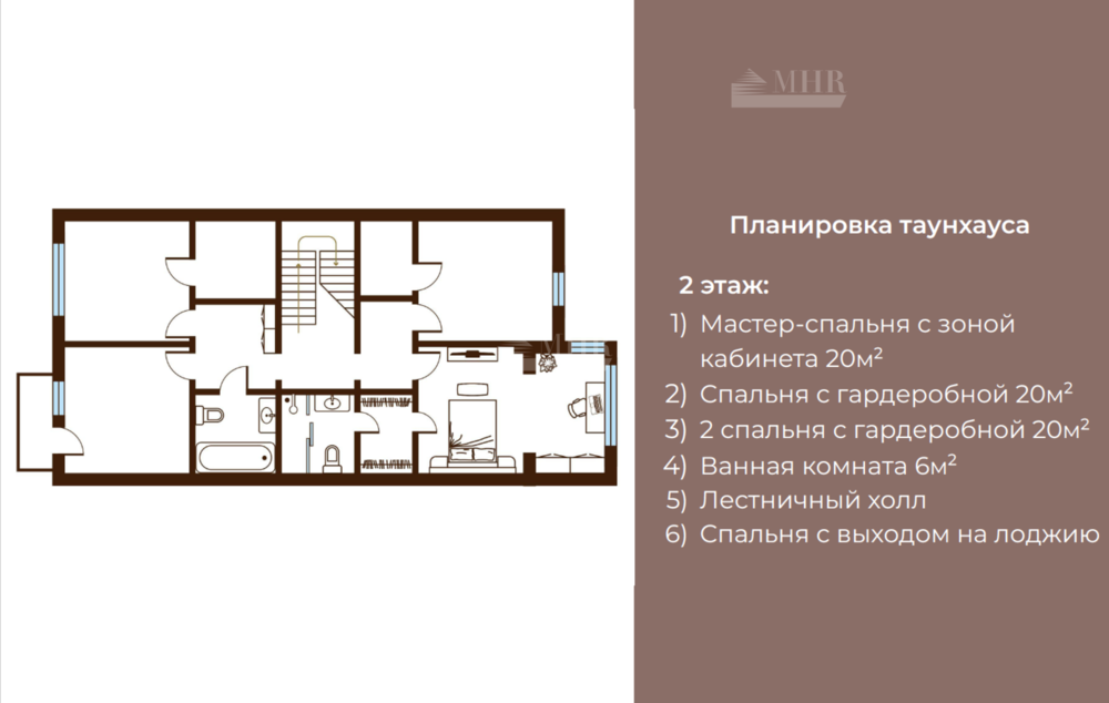 2-й этаж: мастер-спальня с зоной кабинета, спальня с гардеробной, 2 спальни с гардеробной, ванная комната, лестничный холл, спальня с выходом на лоджию.